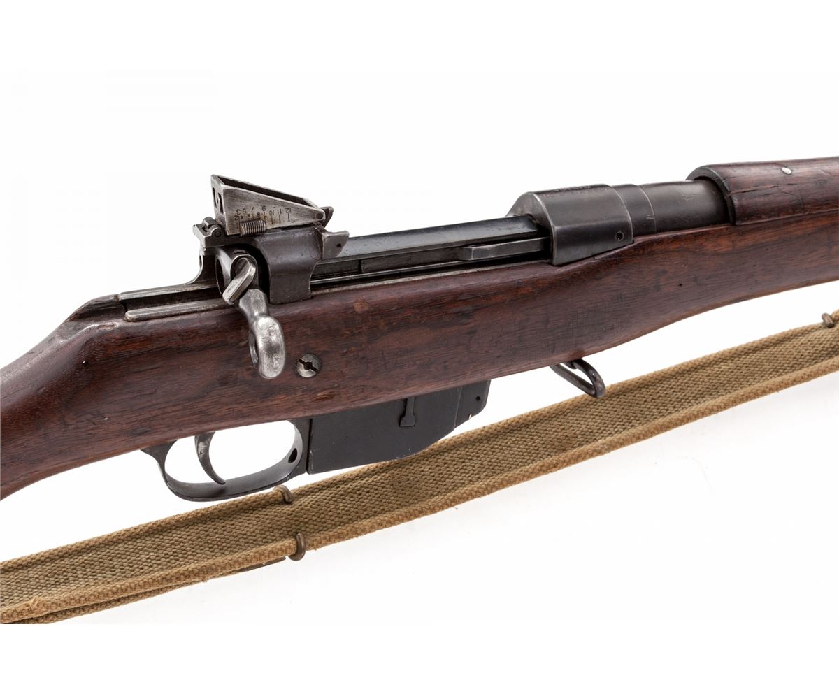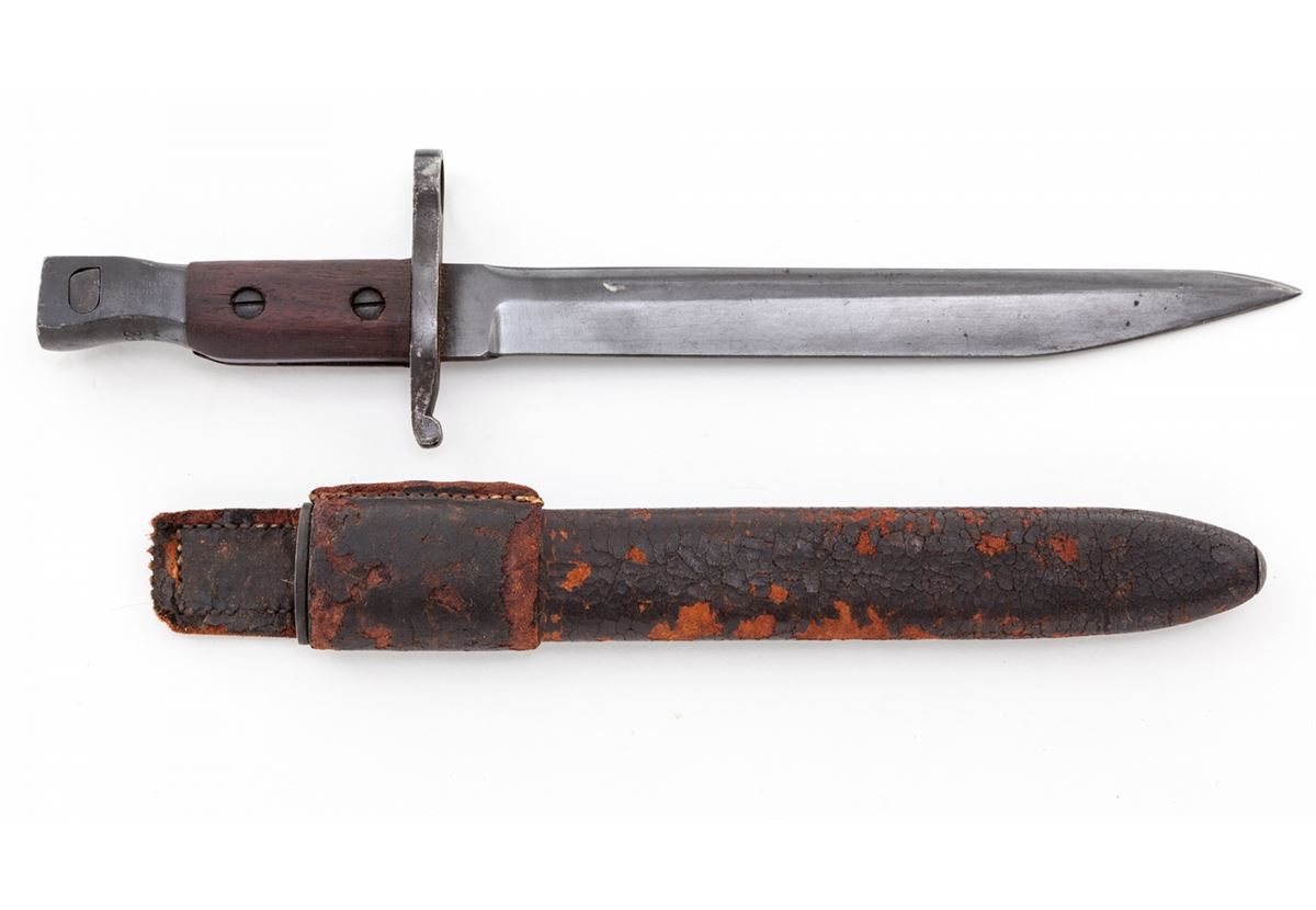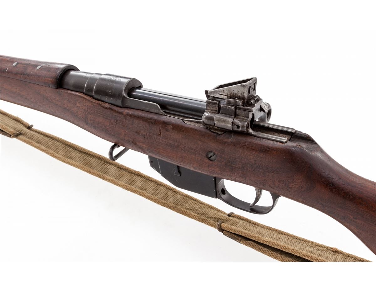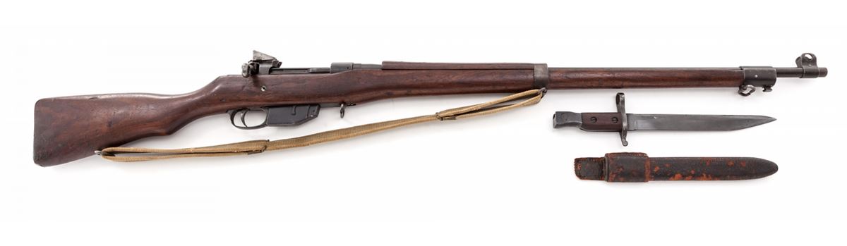Canadian Ross M-10 Straight-Pull Military Rifle, #C9709, .303 cal., 31'' barrel, blue finish, walnut stock and upper handguard, with P-37 canvas sling, and correct 10'' bladed bayonet and scabbard. Condition is very good to near fine retaining approx. 85%-90% blue. Stock with light to just moderate scuffs and scratches. Action and bore are good. Bayonet appears to have been arsenal refinished at one point; scabbard with flaking to leather finish. Est.: $600-$800. (C&R)