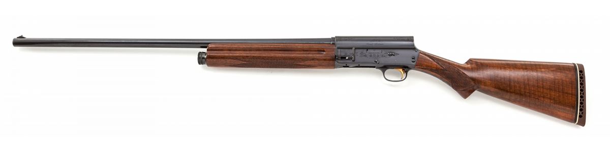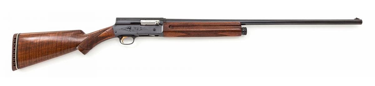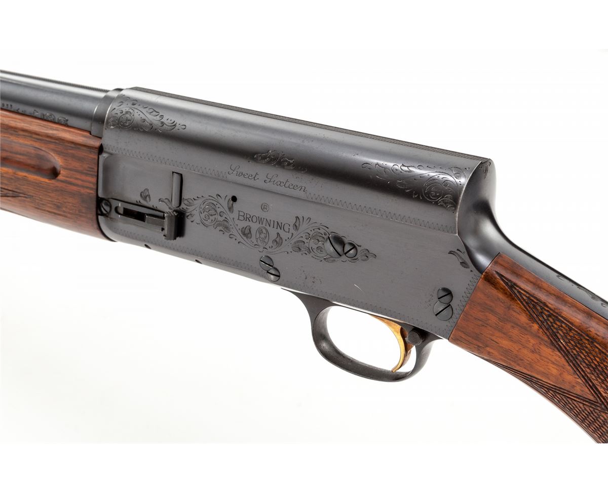 Browning Sweet 16 Auto-5 Semi-Automatic Shotgun, #S10327, 16 ga., 28'' round barrel with matted sighting plain choked Mod., blue finish, gold trigger, jeweled bolt, checkered walnut stock and forend, with nicely fitted Whiteline brown rubber butt pad. Condition is excellent retaining approx. 98% blue with light scratches halfway down the barrel on left side. Belgian proofmarks below operating handle have been polished somewhat thin; finish, however, is original. Stock with light scuffs from handling. Crisp action, bright bore. Est.: $800-$1,200. (C&R)