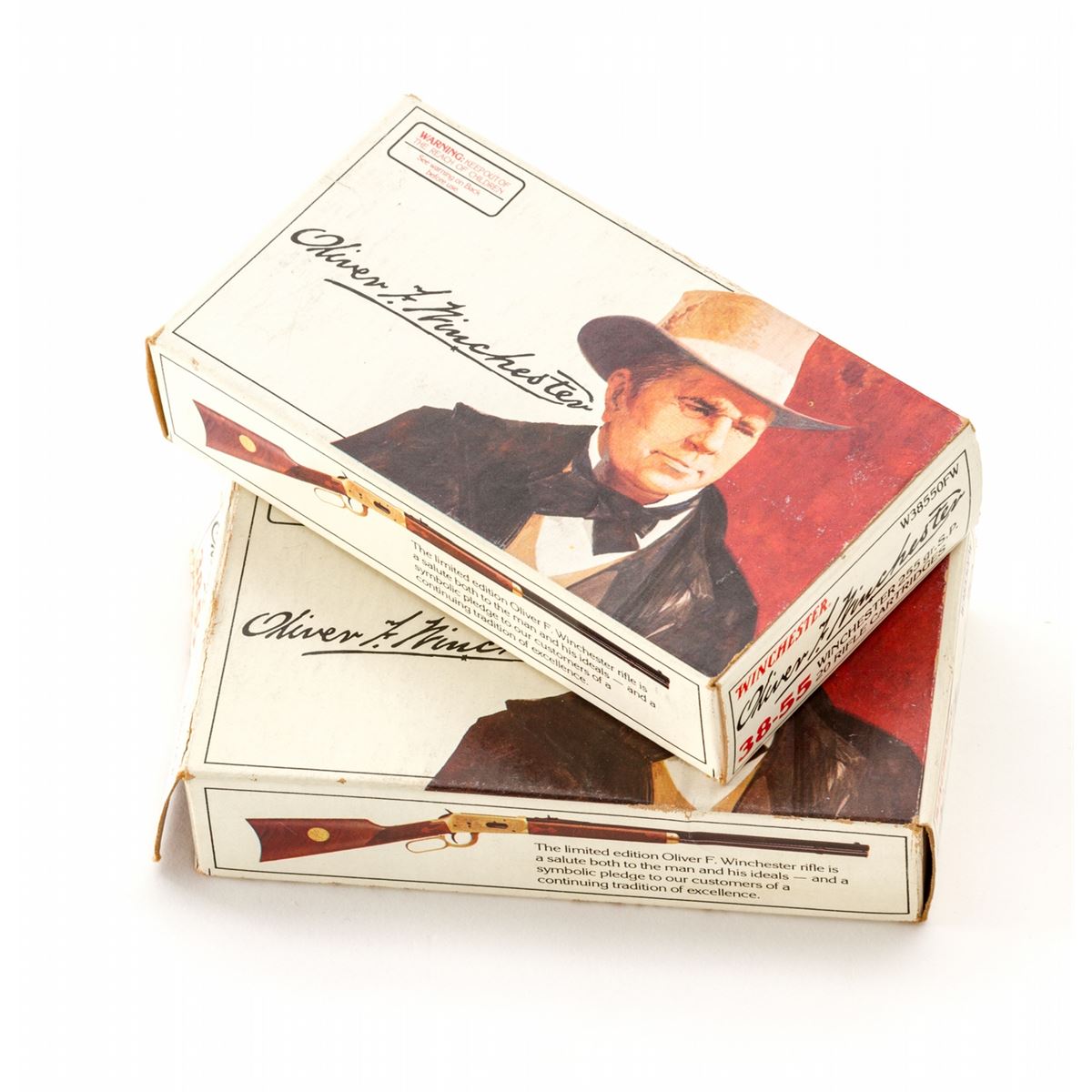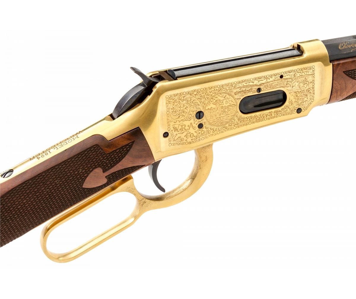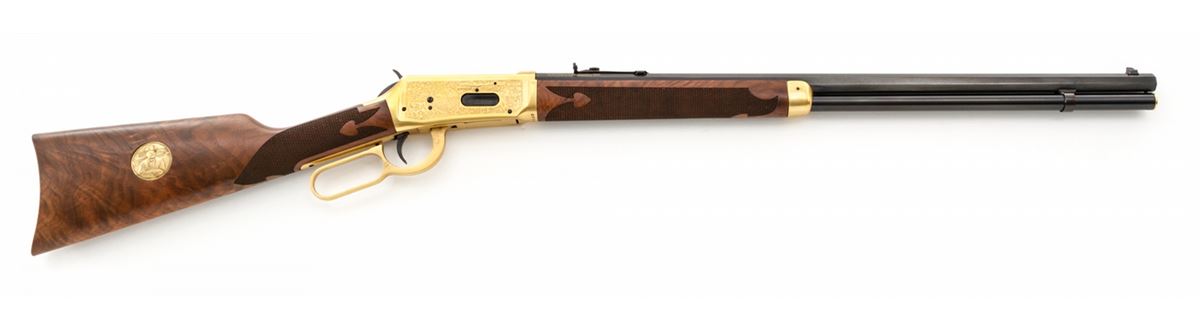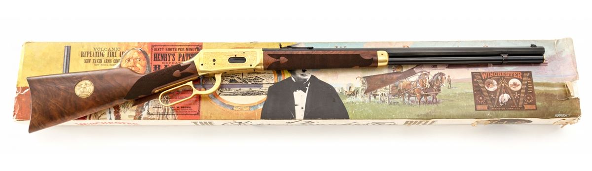 Oliver Winchester Commemorative Model 1894 Lever Action Rifle, #OFW4445, .38-55 cal., 24'' octagonal barrel, roll-engraved gold finish to frame, spade checkered walnut stock and handguard, with Oliver Winchester medallion to buttstock. Condition shows minor discoloration at lever and forend cap, but otherwise excellent. Two (2) boxes of Oliver Winchester .38-55 ammunition are included. External slipcover shows moderate tattering at one end, as well as tape residue. Instructions not included. Est.: $750-$1,000. (Modern)