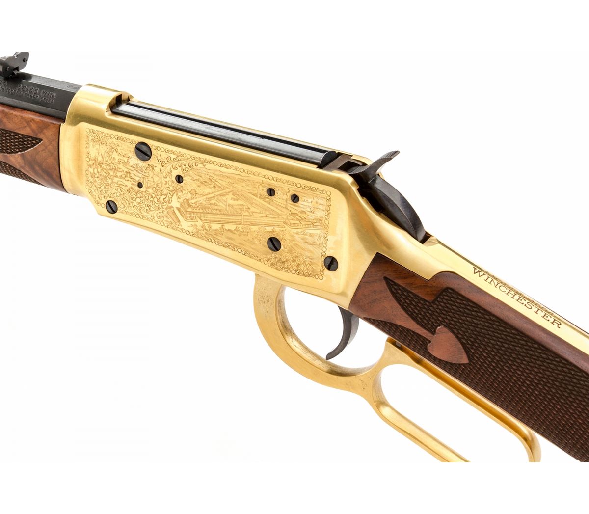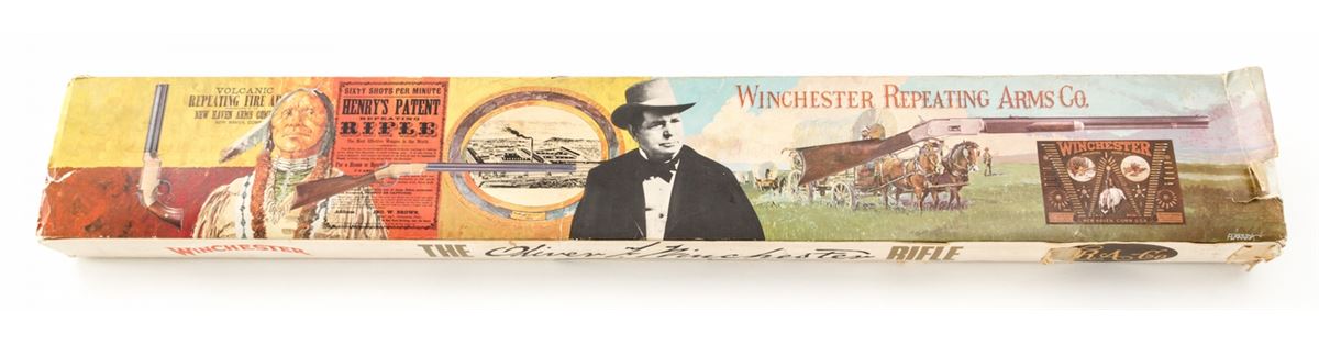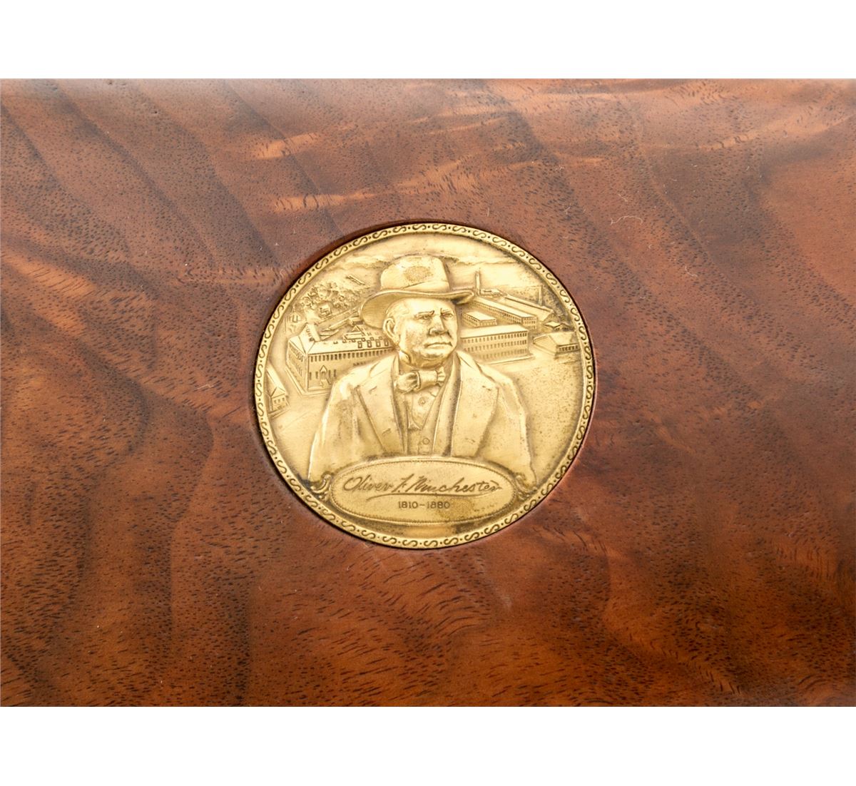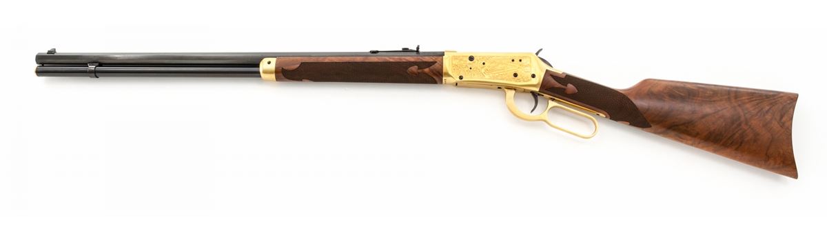 Oliver Winchester Commemorative Model 1894 Lever Action Rifle, #OFW4445, .38-55 cal., 24'' octagonal barrel, roll-engraved gold finish to frame, spade checkered walnut stock and handguard, with Oliver Winchester medallion to buttstock. Condition shows minor discoloration at lever and forend cap, but otherwise excellent. Two (2) boxes of Oliver Winchester .38-55 ammunition are included. External slipcover shows moderate tattering at one end, as well as tape residue. Instructions not included. Est.: $750-$1,000. (Modern)