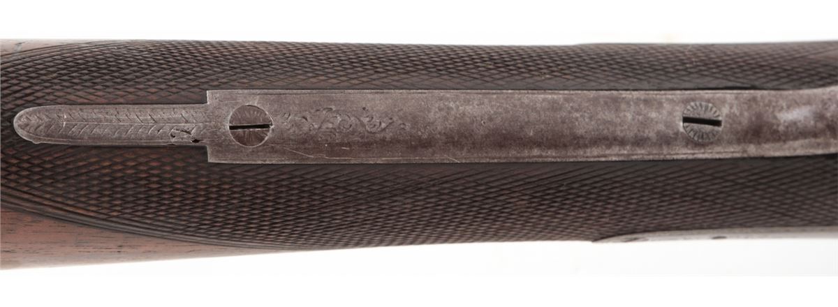 Antique English Side-by-Side Shotgun, by J.R. Cooper, NVSN, 11 ga., 32.75'' Damascus barrels, underlever, double triggers, straight-grip checkered walnut stock with splinter forend, and fancy game scene gutta percha buttplate. Condition is good with moderate general toning and patination. Action is tight, bores are fair to good. Est.: $500-$750. (Antique)