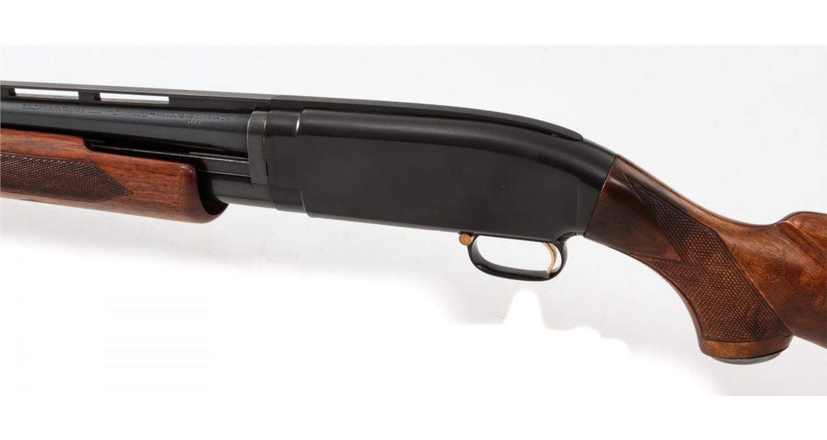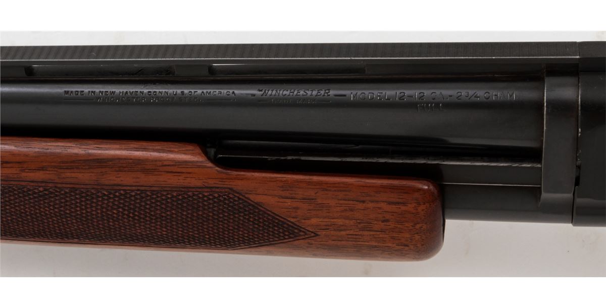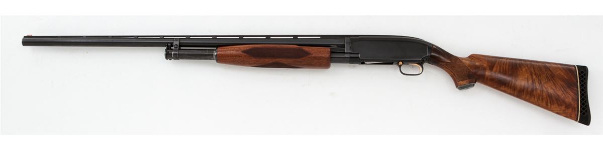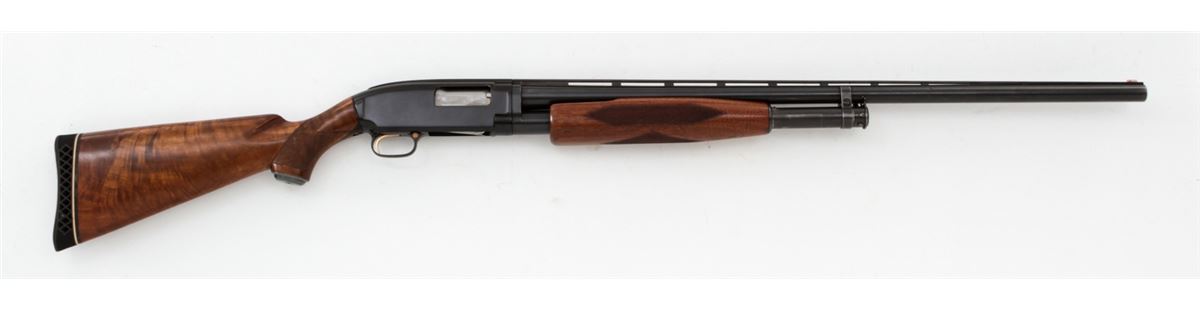 Winchester Model 12 Heavy Duck Pump Action Shotgun, #1210871, 12 ga., 30'' vent rib barrel for 2-3/4'' chambers choked Full, blue finish, nicely figured walnut stock and handguard, with later added Whiteline rubber butt pad. Gold-plated trigger and safety, with fiber-optic front bead. Mfg'd 1949. Condition is excellent as professionally refinished at time of rib installation, retaining approx. 97% blue. Stock shows light marks from field use as pressure dings and fine scratches. Action is good, bore is bright. Est.: $450-$600. (C&R)