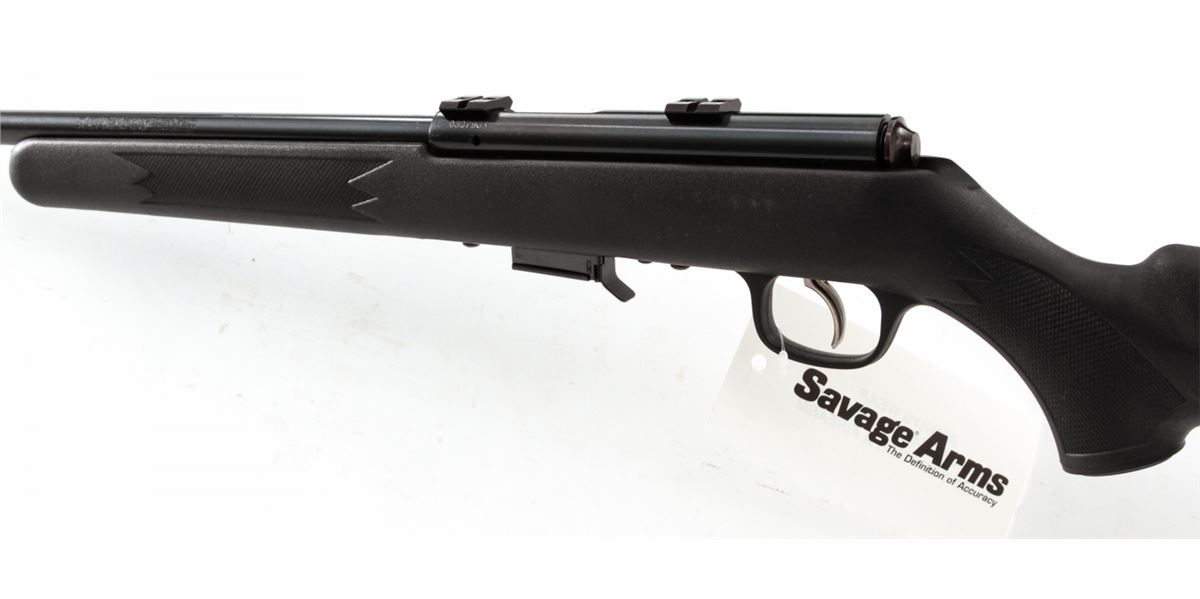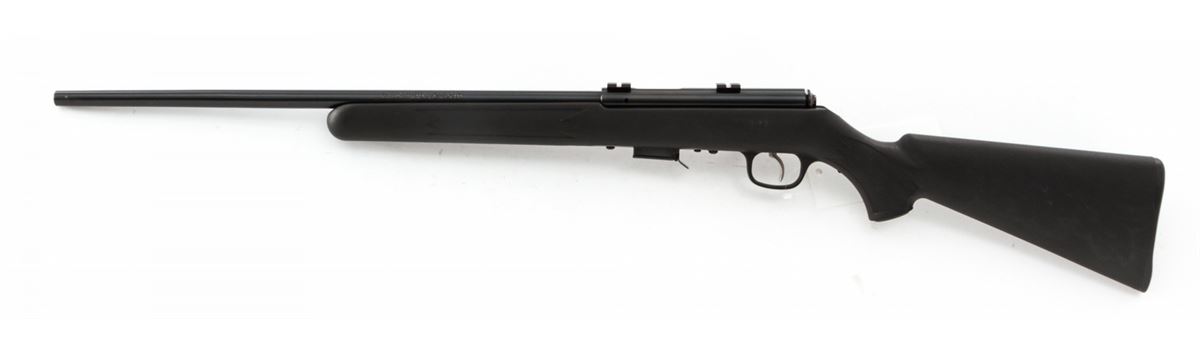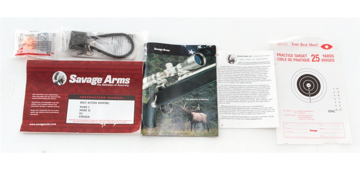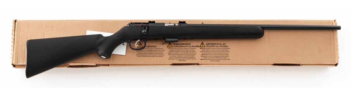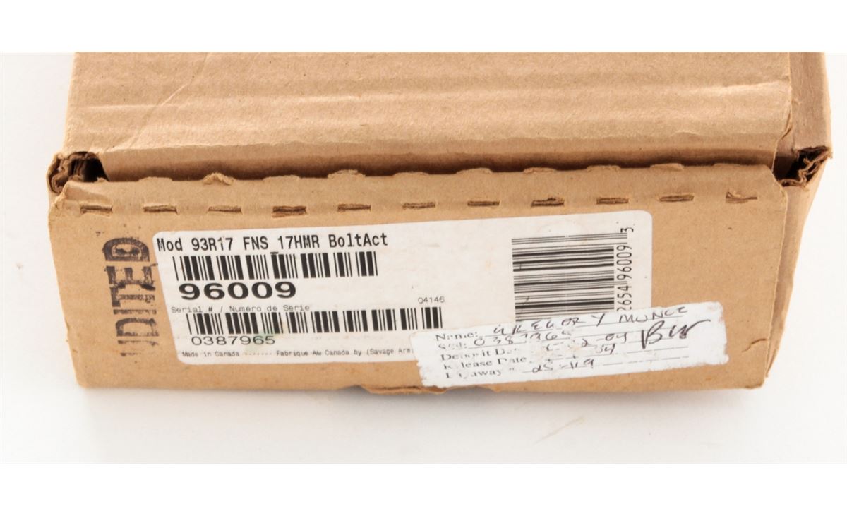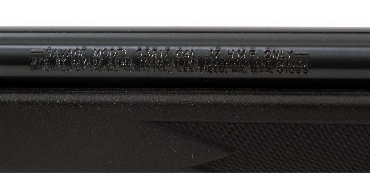 Savage Model 93R17 SFN Bolt Action Rifle, #0387965, .17 HMR cal., 22'' barrel, blue finish, checkered black nylon stock. Condition is excellent, appearing as new and unfired, in its original box. Est.: $250-$450. (Modern)