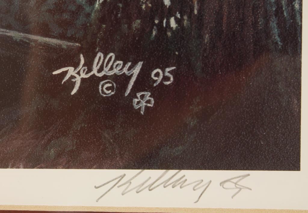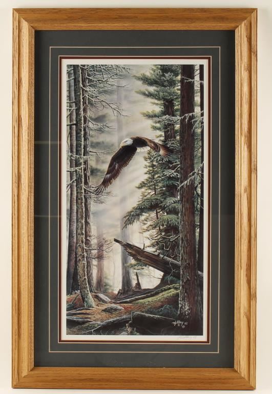 Professionally matted and framed. Rick Kelley is a well known wildlife artist. His wildlife and western art is a visual journal of his life experiences and travels. It is the vision coupled with Kelley's scientifically and historically correct images that have made him one of the most popular and critically acclaimed wildlife artists today. This print depicts a bald eagle winging it through a forest. It is double signed and dated '95. It measures 19" x 30".