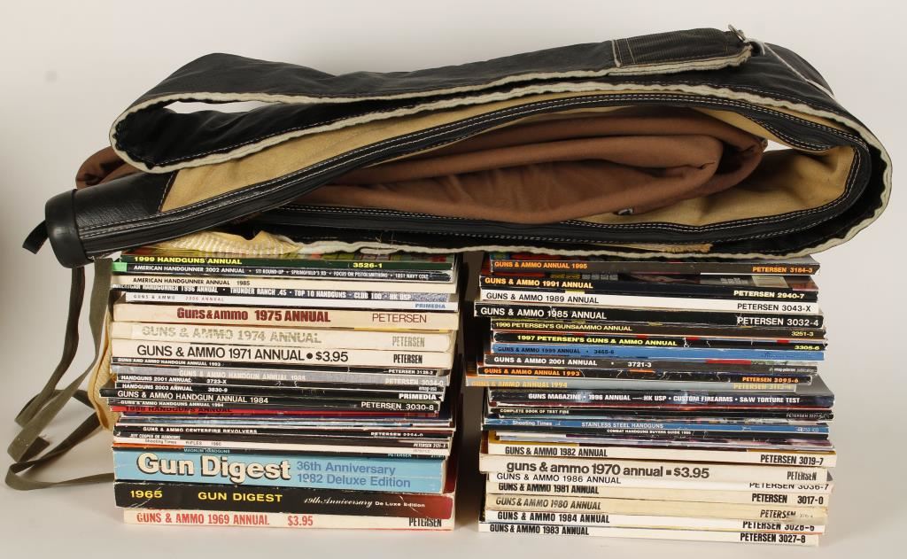 Including (23) Guns & Ammo annuals spanning from 69' to 2006, (11) Handguns annuals, (2) Gun Digest, (17) misc. magazines & 3 rifle boots.