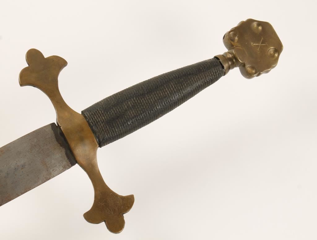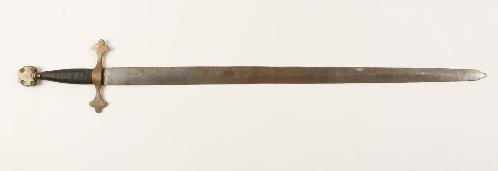 Modeled after the medieval area with brass handguard and leather wrapped handle. Measures 37 1/2 " overall with a 30" blade.