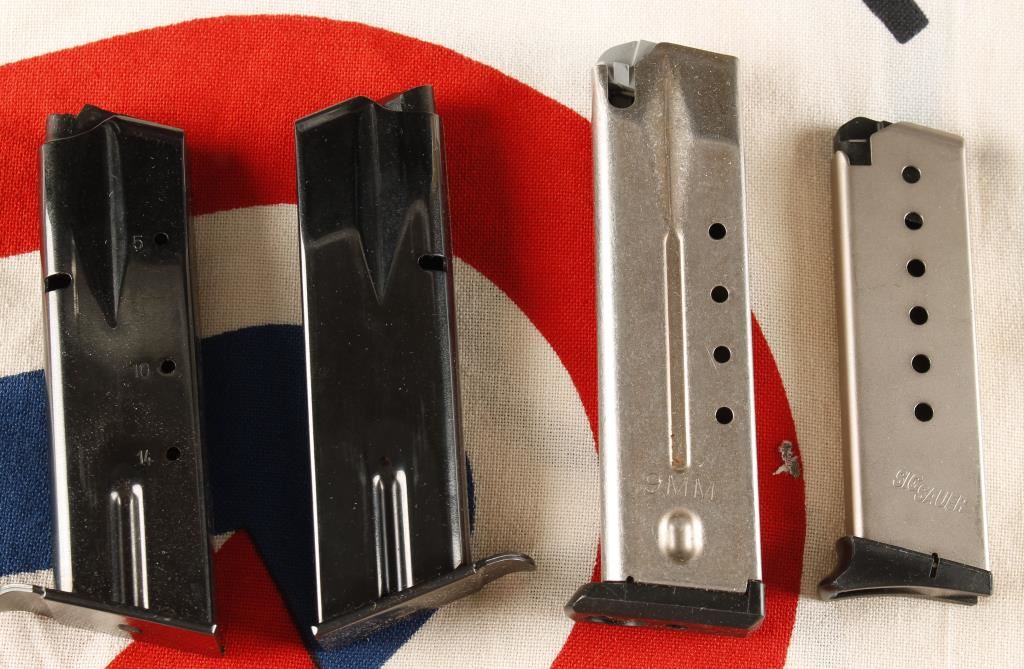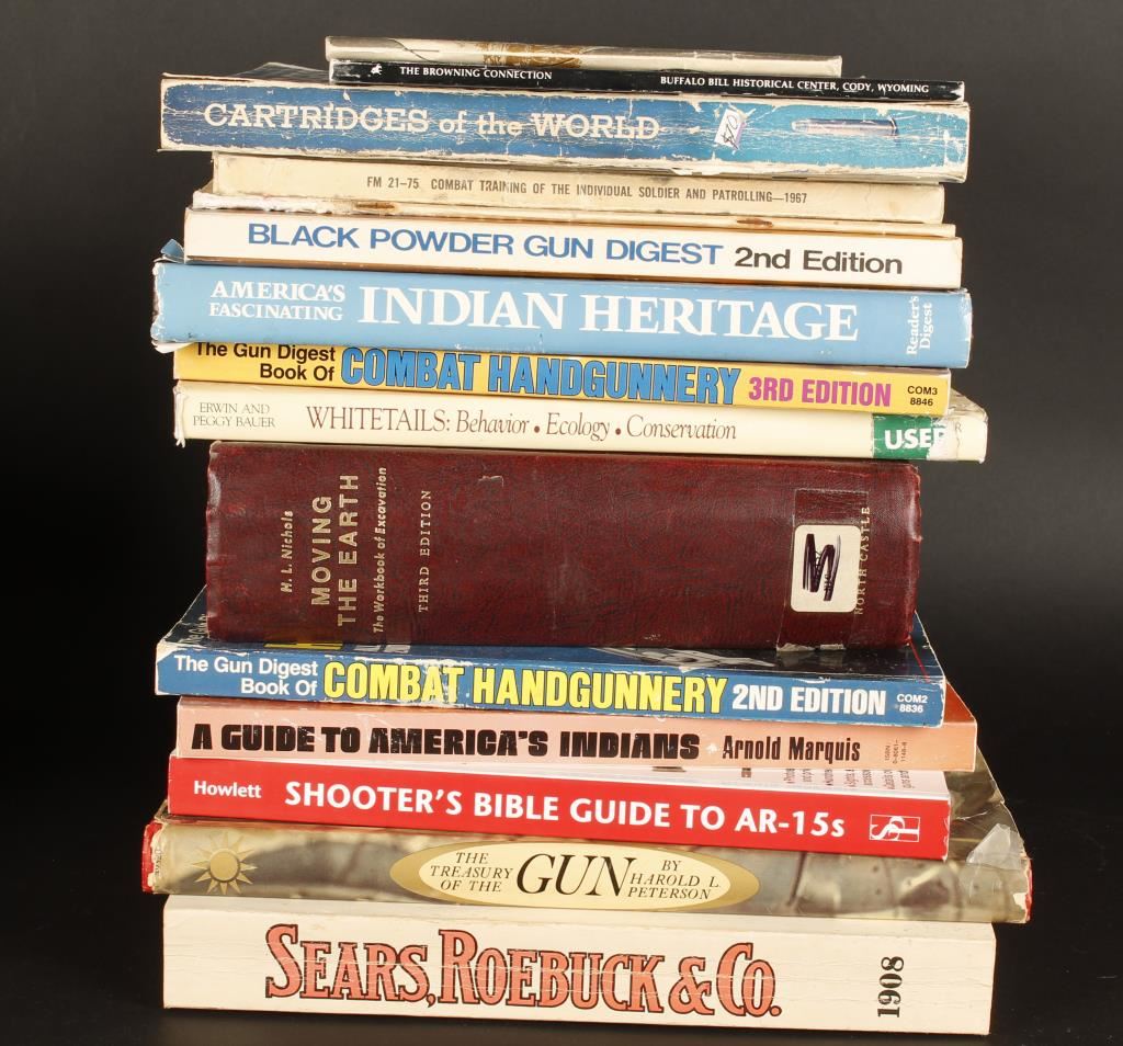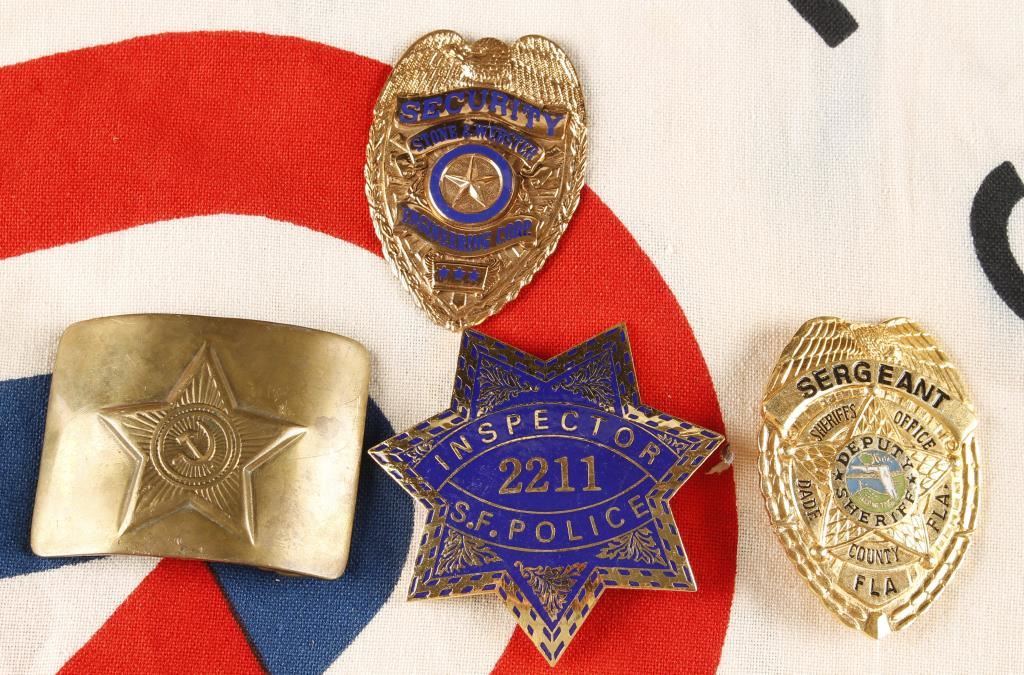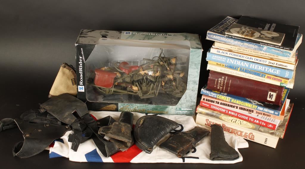 Including; Leather and canvas holsters, 4 Mags, gun related books, repro badges and a belt buckle, Indian Motorcycle Road Rider Toy and a white flag that reads "American Revolution Bicentennial 1776-1976" with a red and blue star in the middle.