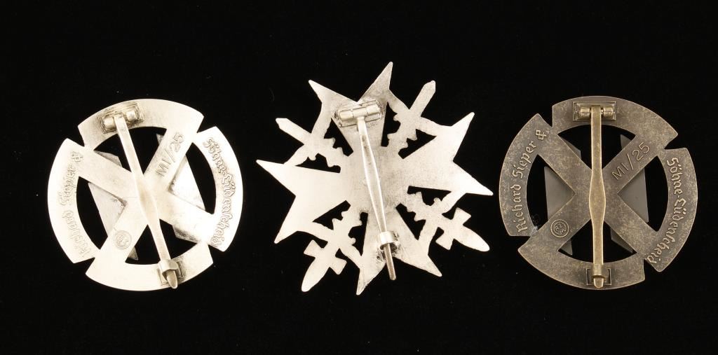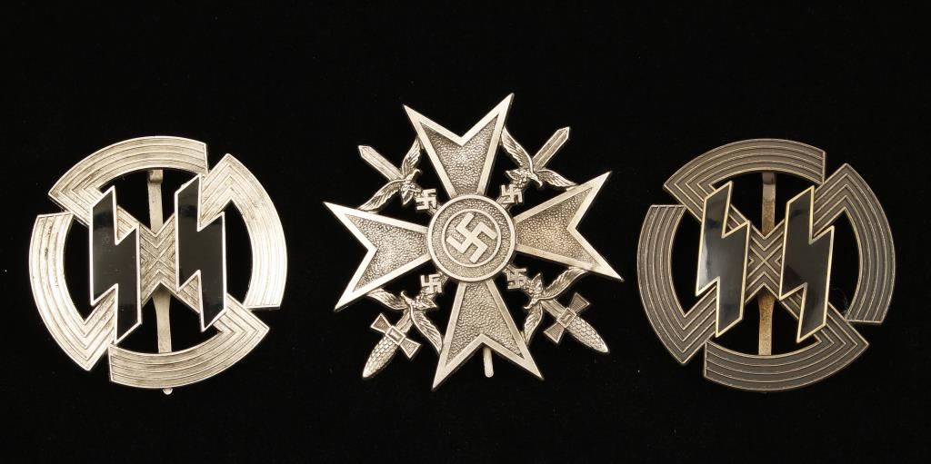 Including; (1)Waffen SS Silver Proficiency Runic Badge. Measures 1 15/16" in diameter, the reverse is maker marked 'Richard Sieper & Sohne Ludenscheid RZM M1/25'. Has a wide vertical pin back. Three piece silver plated nickel construction with a pair of black enameled runics in the center. (1)Waffen SS bronze Proficiency Runic Badge. Measures 1 15/16" in diameter. The reverse is maker marked 'Richard Sieper & Shone Ludenschied RZM M1/25', has a wide vertical pin back . Three piece bronze construction with a pair of black enameled runics in the center., (1) Condor Legion Silver Spanish Cross with Swords. Maker marked 'BSW' in a three leaf clover, has a wide vertical pin back. Nickel construction. Offered "as is", we don't guarantee the authenticity of this item, please do your research. All sales are final.