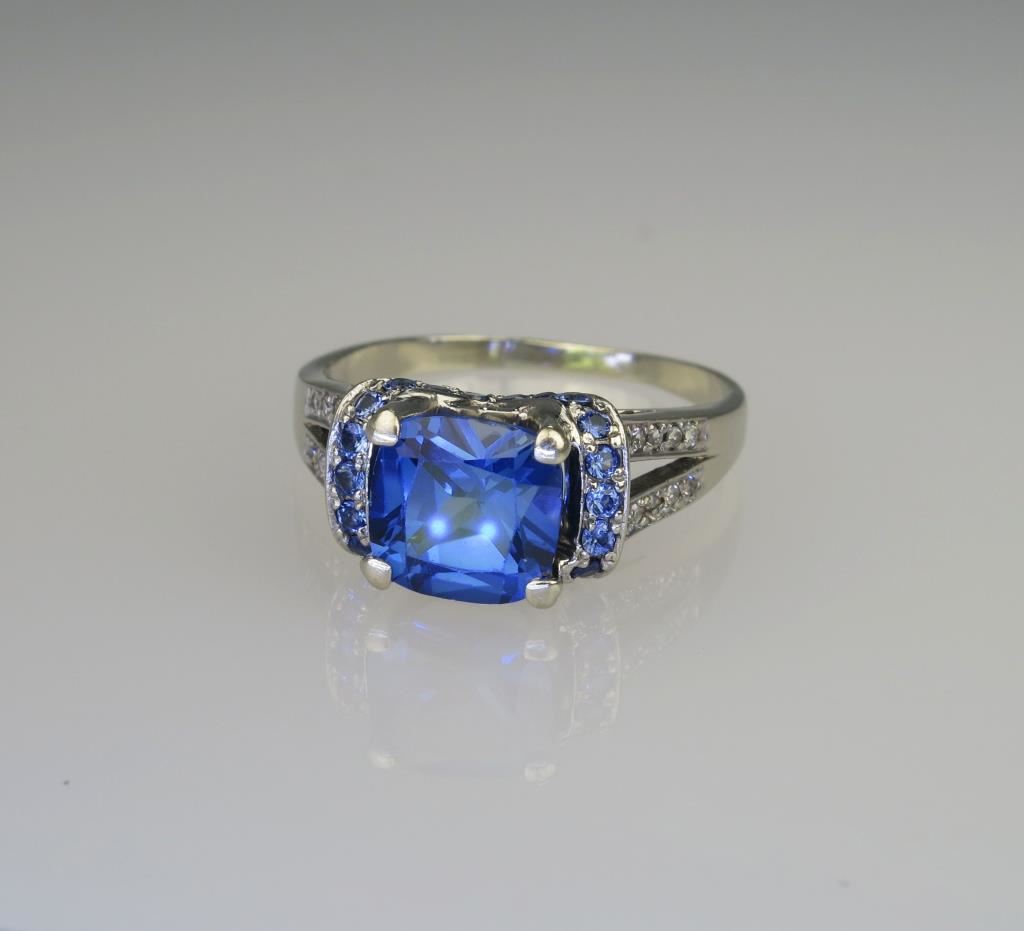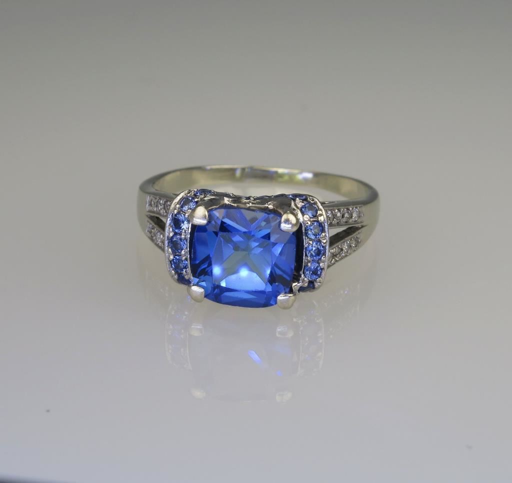 Lot 1409 Princess Cut Created Blue Sapphire & Diamond Ring
