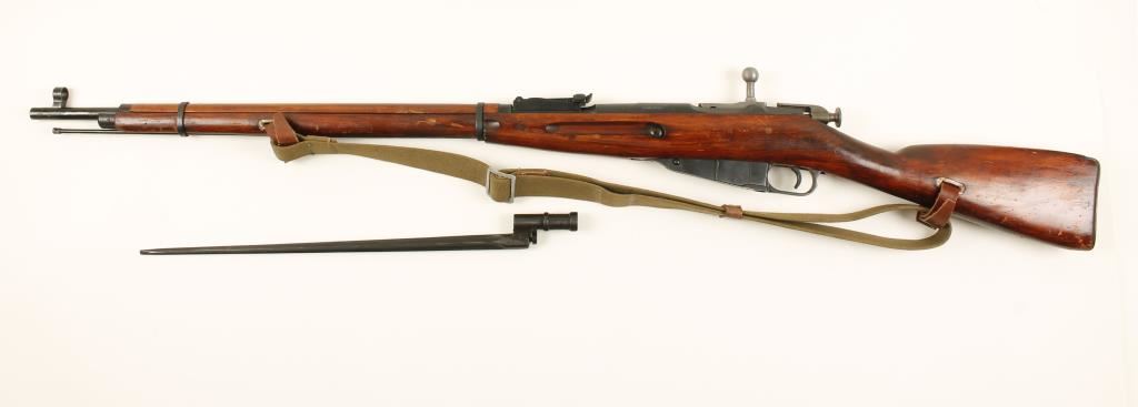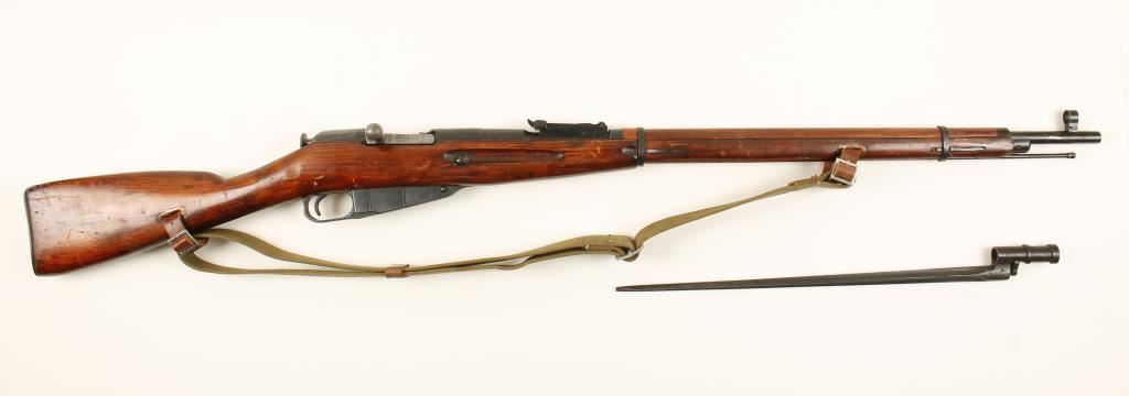 Russian military blued bolt-action rifle with a 29" barrel, a web and leather sling, and a cruciform bayonet with a 17" spike. Made at Tula Arsenal in 1939. Import marked. Bluing is worn and faded with surface rust and pitting. All serial numbers match. Wood has some stamps in the stock and there is a patch repair in front of the sling cut in the butt. There is surprisingly light wear and tear damage on this stock. Bore is dark with moderate rifling. Action is working well. Condition is fair, *Modern Firearm*