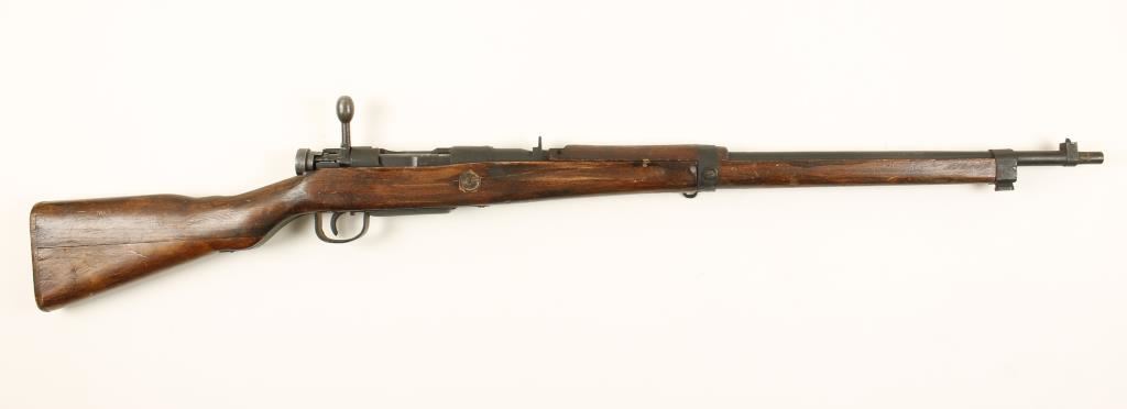 Japanese military blued bolt-action rifle with a 26" barrel and a reproduction bayonet (with a 15-1/2" blade) and scabbard. "Mum" is ground off and there is no Type marking. Fixed rear sight. Metal is all flat black with rough surface. Butt plate is wood. This is a late war product. The stock has a long crack running through the cross bolt back almost to the upper tang and forward to below the upper handguard. Bore is dark with rifling. Action is working. Condition is poor. *Modern Firearm*