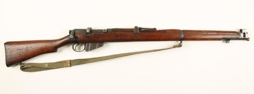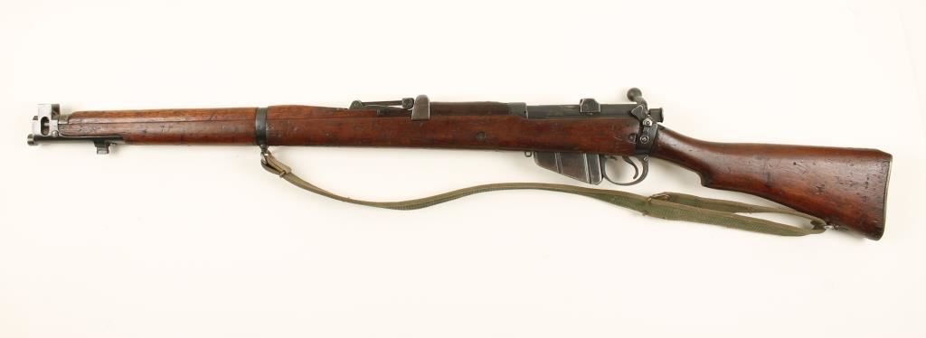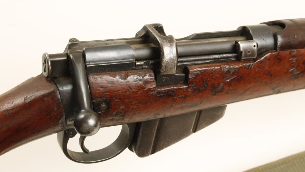 Indian made British military blued bolt-action rifle with a 25-1/4" barrel, one magazine and a web sling. Import marked. Made in 1952. Bluing is faded with edge wear and surface rust. The brass butt plate is scratched and the trapdoor conceals a pull-through. The butt has a cartouche on the side with letters "TDEW" and a broad arrow, and many small stamps on the bottom of the stock behind the trigger guard. Stock has usual damage and dings. The rear hand guard has a repaired crack in it. Bore is dark with rifling. Action works well. Condition is fair. *Modern Firearm*