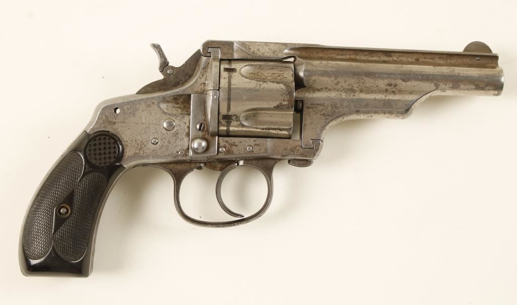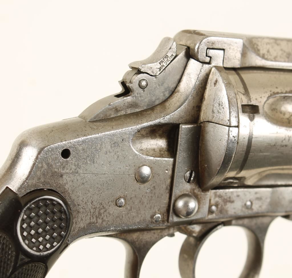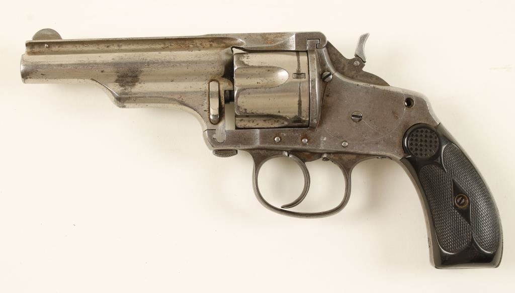 Nickel plated 5 shot twist-open revolver. 3.5" barrel fixed sights, folding hammer spur and checkered black hard rubber grips. 70% finish remaining on barrel and cylinder the rest of the gun has a dull grey patina. Trigger seldom engages the hammer and the cylinder spins freely. Also appears to be missing a screw from the frame. Overall condition is fair. *Antique Firearm*