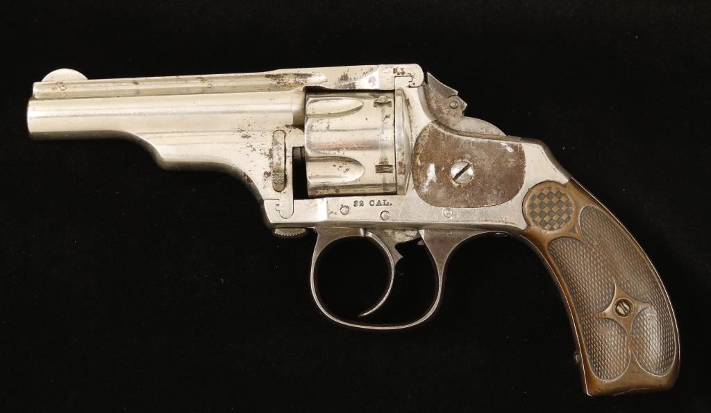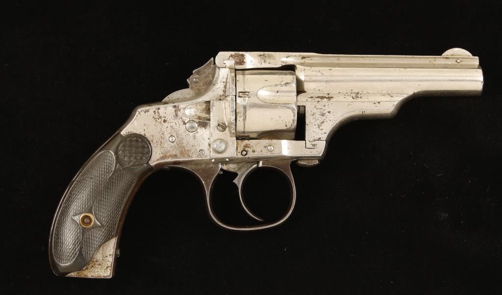 Nickel plated 5 shot twist-open small frame revolver. 3" barrel, fixed sights, folding hammer spur & checkered hard rubber grips. Over 50% finish remaining with no finish remaining on frame panel. Right grip has a large chip missing & the left grip has turned to a green/brown color. Action functions very poorly. Overall condition is poor to fair. *Antique Firearm*