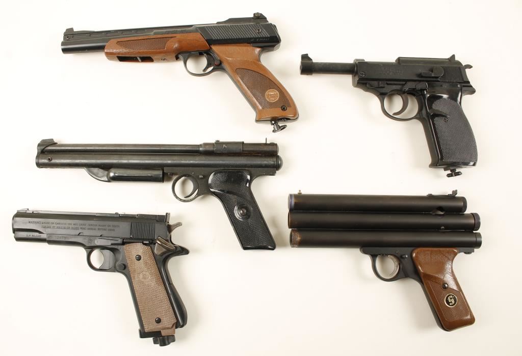 Including; Sheridan paintball gun, Powerline 1200 by Daisy, Crossman pellet gun, Daisy 1911 style pellet gun, and a P38 look alike non gun.