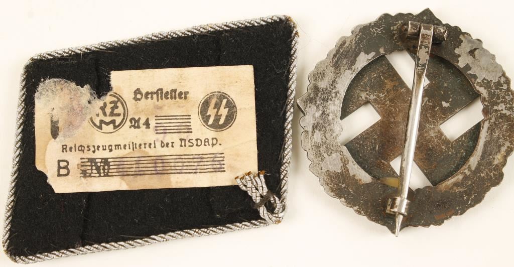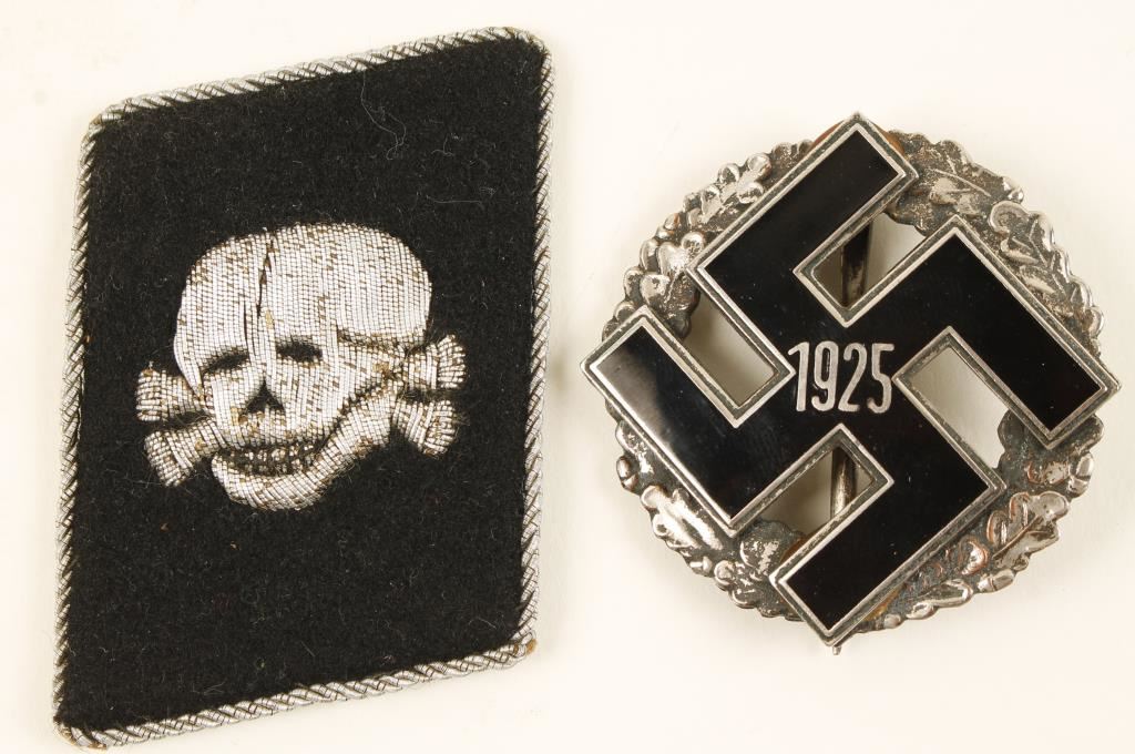 Black enamel swastika nickel platted on back possible reproduction. Includes Nazi death head patch, blue with silver embroidery with SS label on back. Offered "as is", we don't guarantee the authenticity of this item, please do your research. All sales are final.