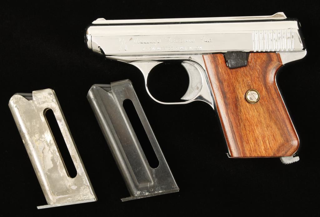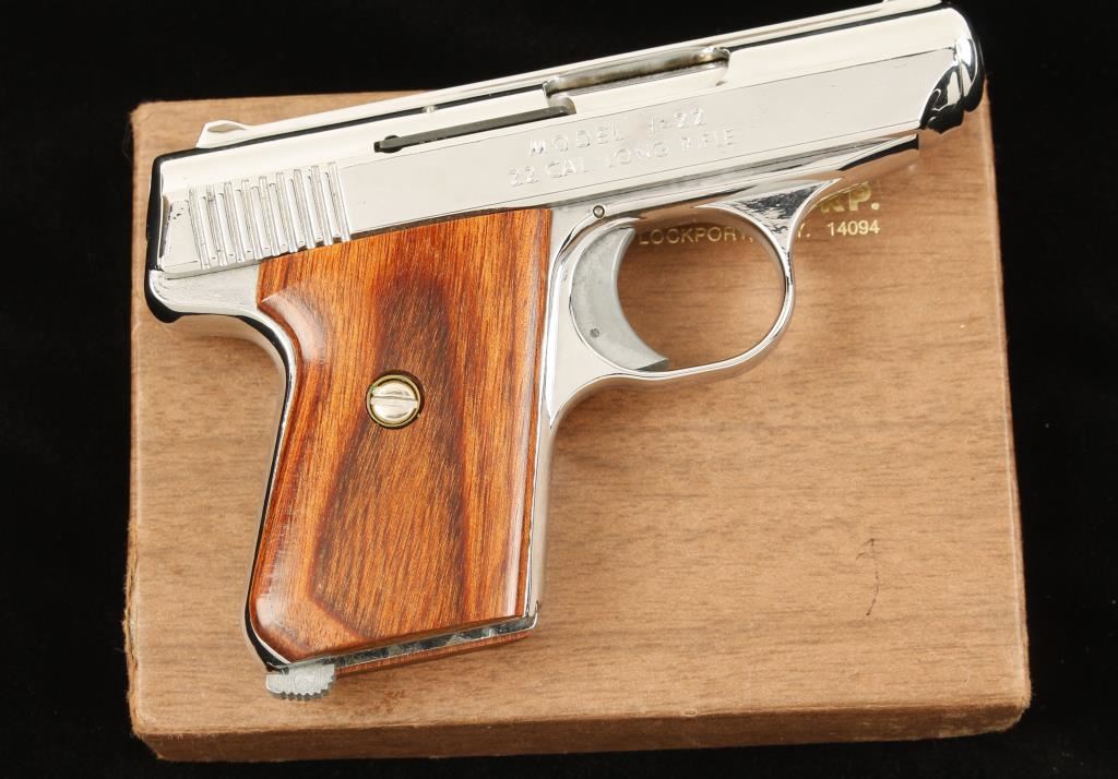 Nickel plated semi-automatic pistol. With wood grips, two magazines, push button safety. Made by Calwest Co.. Overall condition is good, comes in sterling arms box. *Modern Firearm*