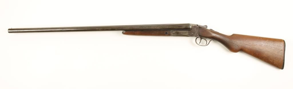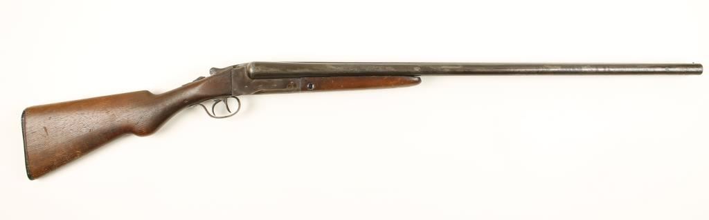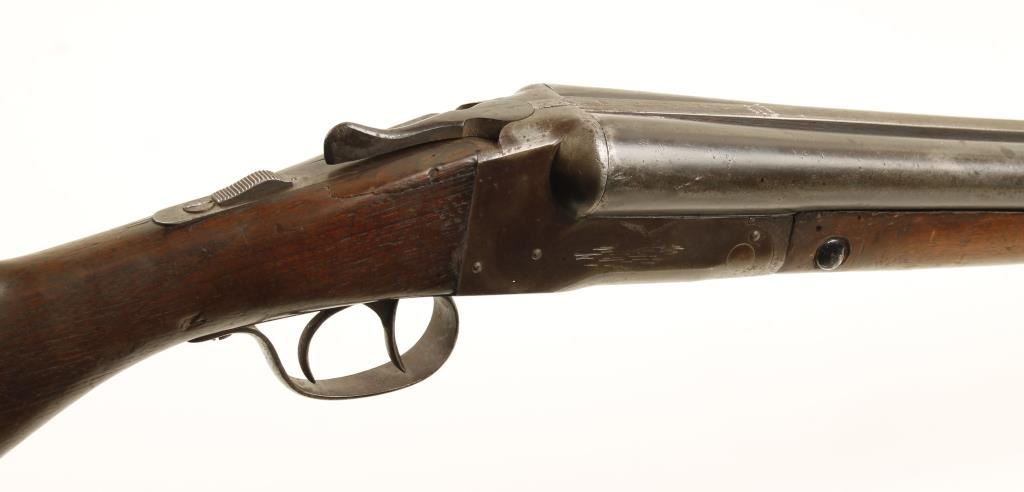 Side by side double barrel shotgun. 30" blued barrels retain about 40% of original finish but show heavy pitting. Receiver has brown patina, bores are very dirty, has double set triggers, safety switch and bead sight. The stock is in poor condition showing much wear, cracks, repair and once checked areas have been worn smooth. Overall condition is poor. *Modern Firearm*