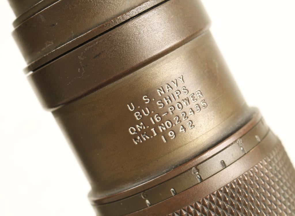 Markings, 'US Navy BU Ships QM. 16-power Mark I #22435 1942'. Shows age and use. Needs to be cleaned.