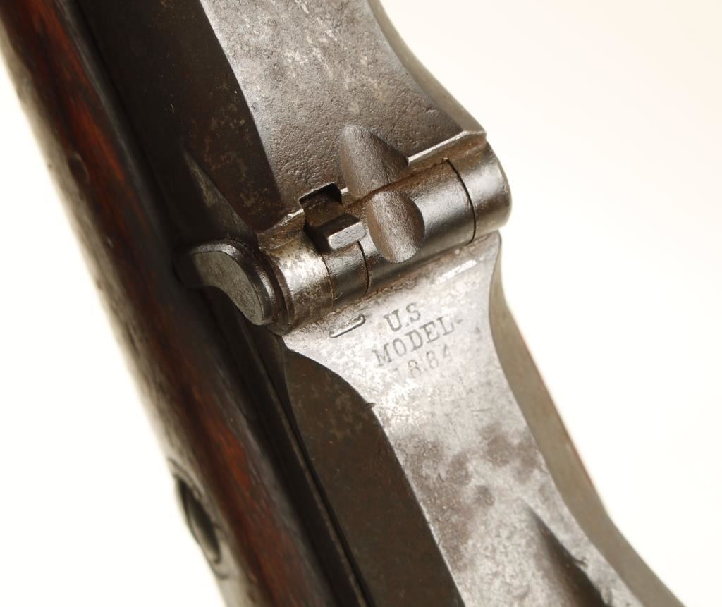 Traditional US Springfield rifle with graduated sights. Clear stamping on lock and US Model 1884 on top. Barrel is also marked 'VP'. The finish has turned to matte brown. 31" barrel with traditional wood stock. Condition is overall Fair to Good for age, Stock has several use dings and scratches and metal shows some mottling and surface rust. *Antique Firearm*