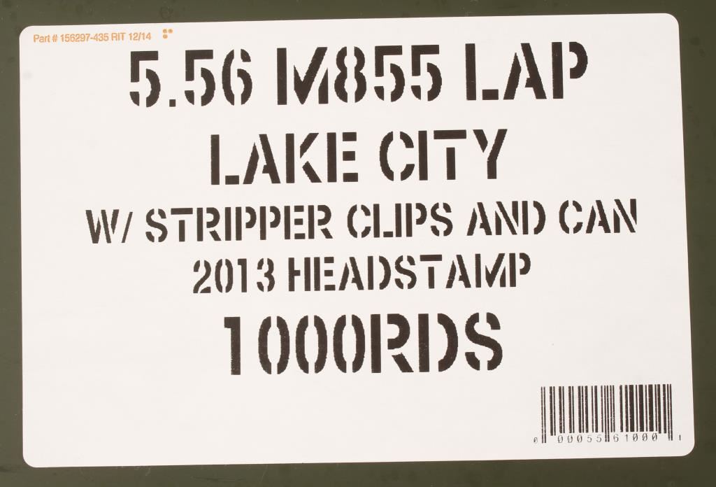 1000 rounds of 5.56 M855 LAP Lake City green tip ammo in 10 round stripper clips enclosed in metal ammo canister. 2013 headstamp. This ammo is currently legal and able to be purchased, however government is trying to pass a law where it can no longer be purchased due to the fact that these are armor piercing bullets....buy 'em while you can!!!