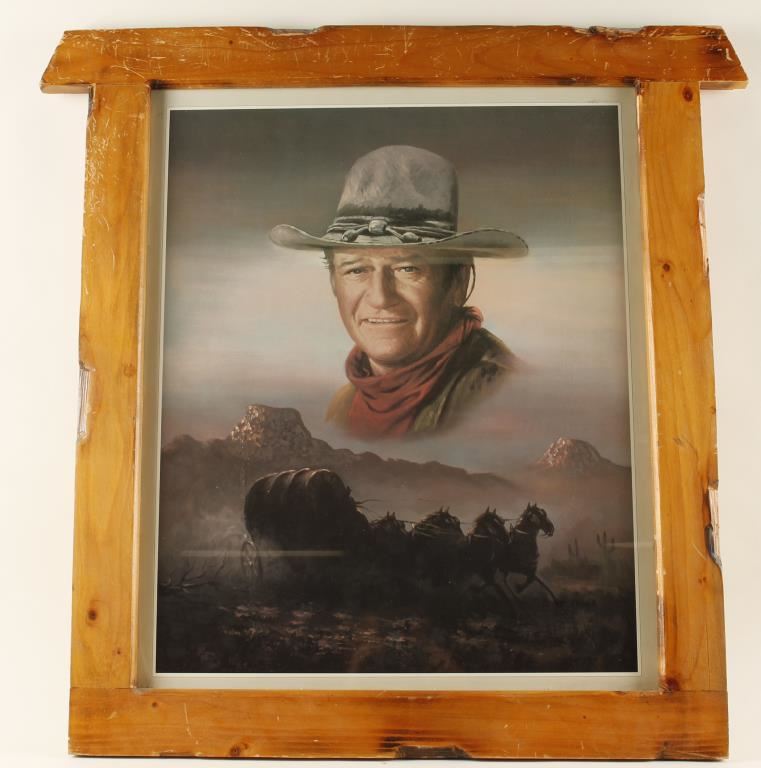 In very rustic wooden frame. Depicts John Wayne's face in cowboy hat and kerchief above a horse drawn covered wagon that is moving through a Western landscape. Measures 22 3/4"x26 3/4" (image size 18"x22")
