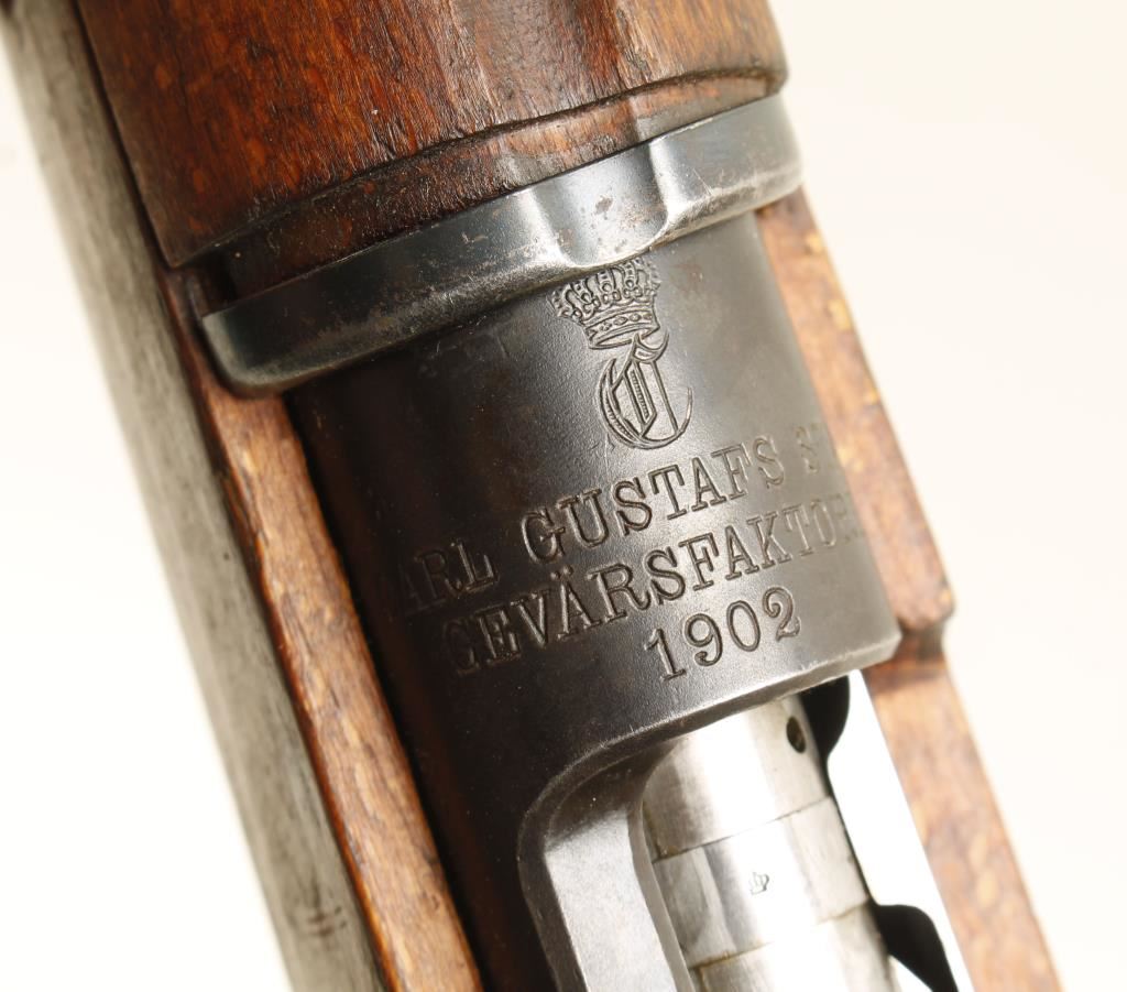 Swedish military blued bolt-action carbine. Made by Carl Gustafs in 1902. Serial numbers all match except for the buttplate, rings, and barrel rings. Condition is overall fair to good. Shows dings and scratches to stock. Barrel and action have high edge wear *Modern Firearm*