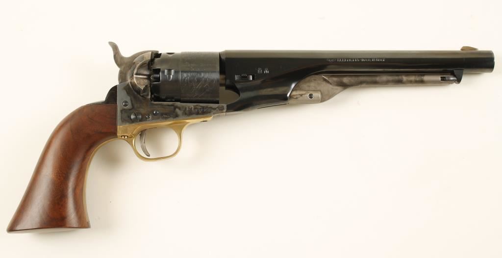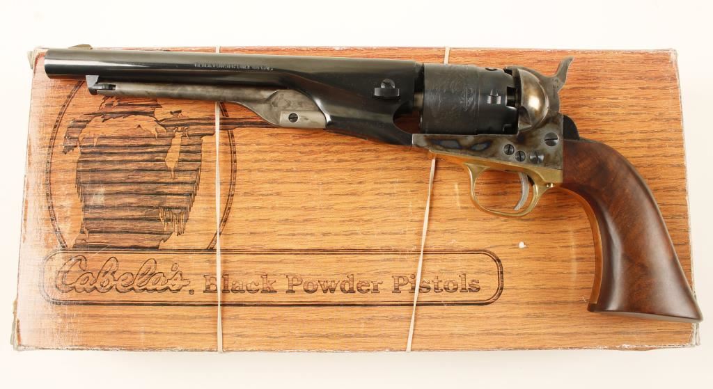 SN; P72592. Black powder replica of the 1860 Army, Case Colored Frame, Blued Barrel and cylinder, Brass trigger guard, wood grips, crisp cylinder scene. Includes original Cabela's box. Condition is overall excellent. *Antique Firearm*
