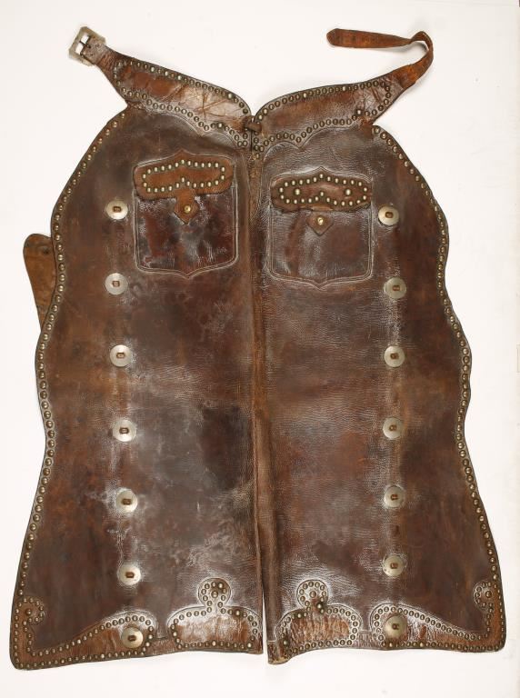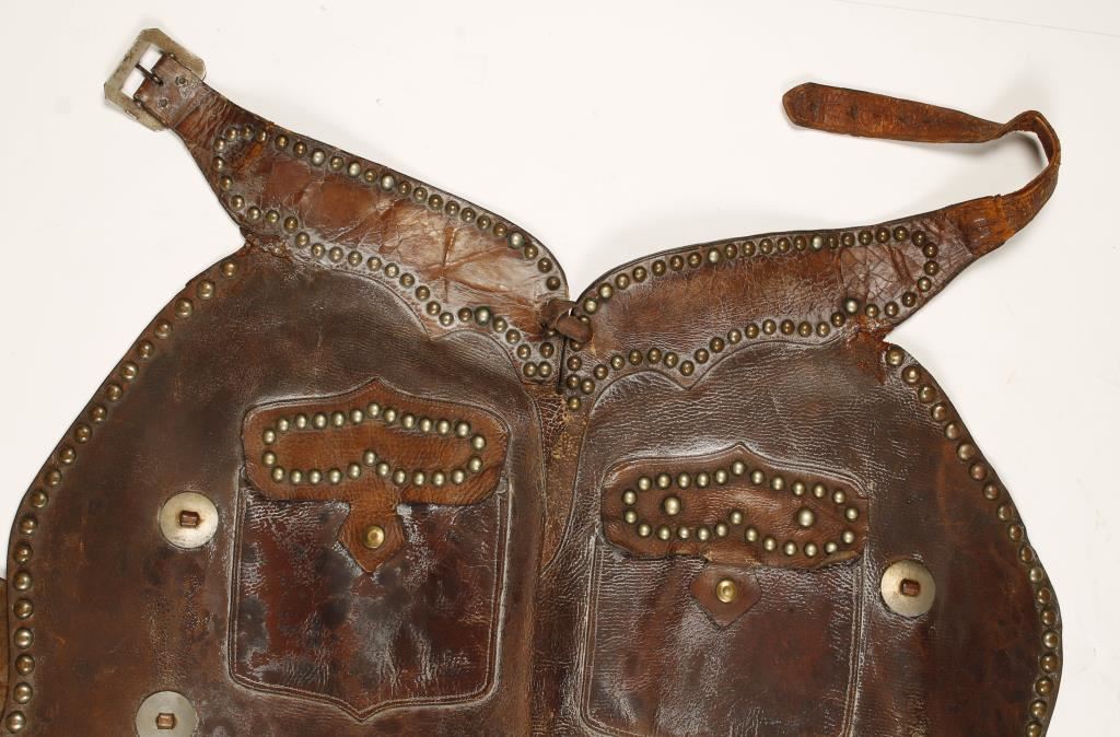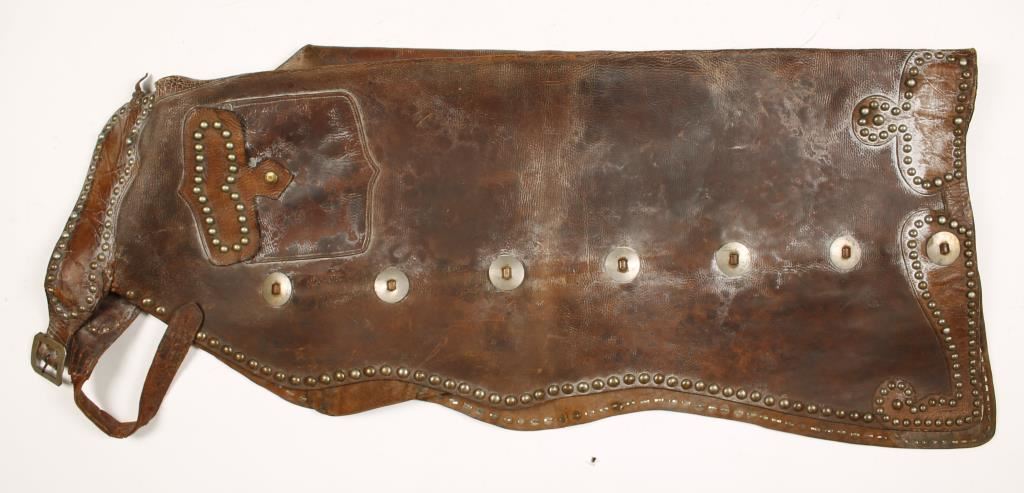 Unmarked with front flap pockets, nickel conchos. Shows age.