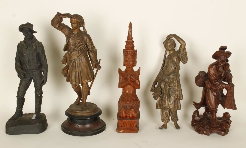 2 Asian wood carvings, plaster of Paris figure of a Civil War gentleman which has damage to face and feet, and 2 metal Moroccan figures.