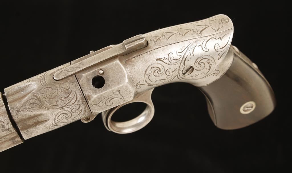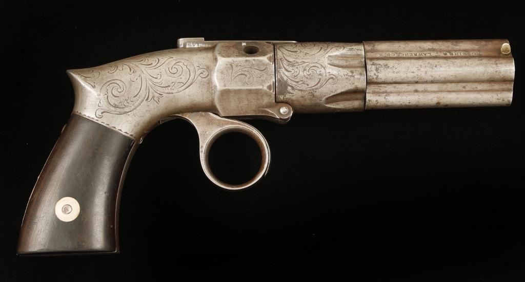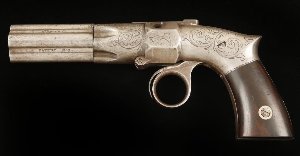 Once blued, scrollwork engraved 5-barreled percussion pistol with 3.5" barrels. Finish has worn back to bare metal. Action doesn't work reliably. Wood grips are a wonderful fit with little damage. Condition is good to very good. *Antique Firearm*