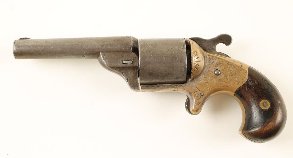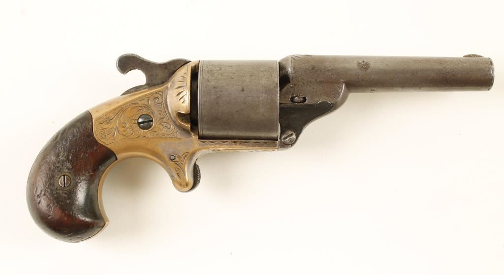 Engraved brass and steel single-action spur trigger teat-fire 6-shot revolver with a 3-1/4" barrel and wood grips. Steel has faded to a grey patina with some splotches of surface rust. Cylinder is marked "D. Williamson's Patent January 5, 1864". Brass frame has residual evidence of silver plating with fine engraving. The bore is shiny with strong rifling and light to moderate pitting. Chambers are dirty. Grips have worn to be smaller than the frame and have numerous dings. Action works well with slightly loose lock-up. Condition is good. *Antique Firearm*