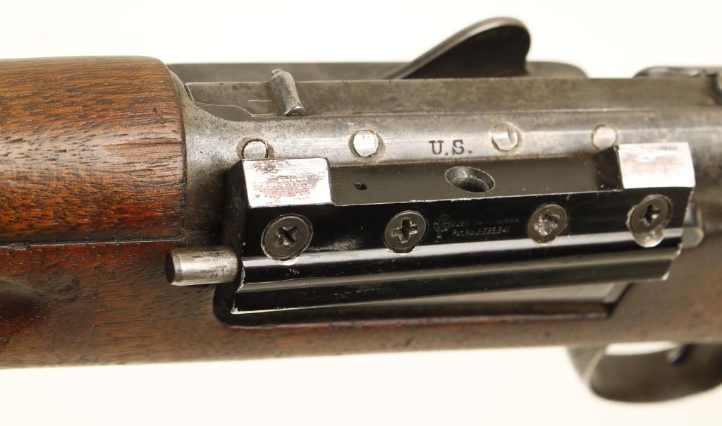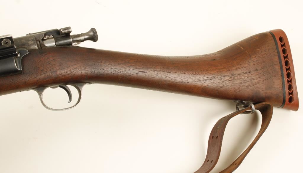 Blued sporterized military bolt-action rifle with a 24" barrel, scope mount, recoil pad and sling. Bluing has extensive edge and high point wear with some mottled patina. There are 4 filled holes high on the left side of the receiver and a Kruzell scope mount with four screws in it. The mount obscures the serial number and model year. Bore is bright and shiny with rounded rifling. An enormous front sight has been added. Action works well. Stock has been cut down with major cut on the comb of the butt and a wood insert was added to fill a hole in the top of the butt. There is a "circle P" cartouche behind the trigger guard and many dings, rubs and scratches in the surface. Condition is fair. *Modern Firearm*