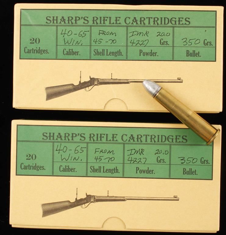with 350 grain bullets, 28.5 grains of IMR 4227 powder and modified Remington .45-70 brass shells. In vintage Cheyenne Cartridge Boxes.