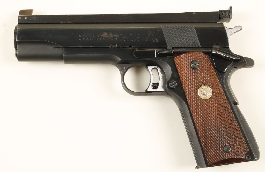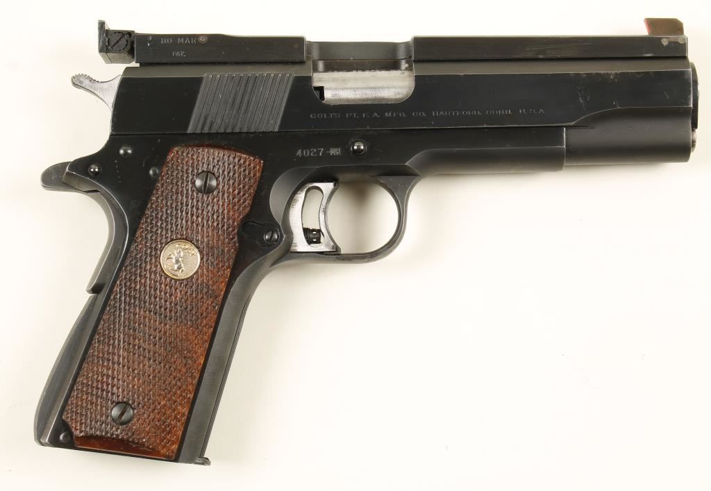 Blued Series 70 Colt 1911A1 with a 5" barrel, Bo-mar rib adjustable sight, wide serrated adjustable trigger, one .38 Special magazine and checkered wood grips with Colt medallions. Made in 1963. Fires wadcutter ammo only. Bluing finish is matte and polished with a few very small spots of surface rust freckles and tiny pits and a wear spot on the flats of the slide and light wear, rubs and tiny areas of pitting on the frame. High point edge wear on, and below, the thumb safety. Barrel is stamped "MK. III". Bore is mirror bright with sharp rifling. Action is very slick and smooth. Grips are impeccable with screw head slots in fine sharp condition. One screw head has a dent in it and one has a slight touch of edge wear. Condition is excellent. *Modern Firearm*