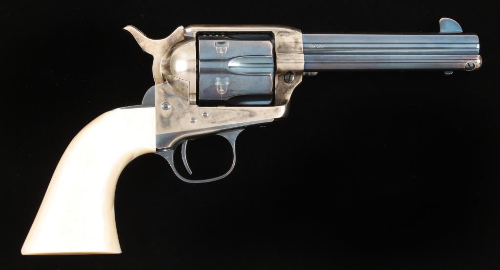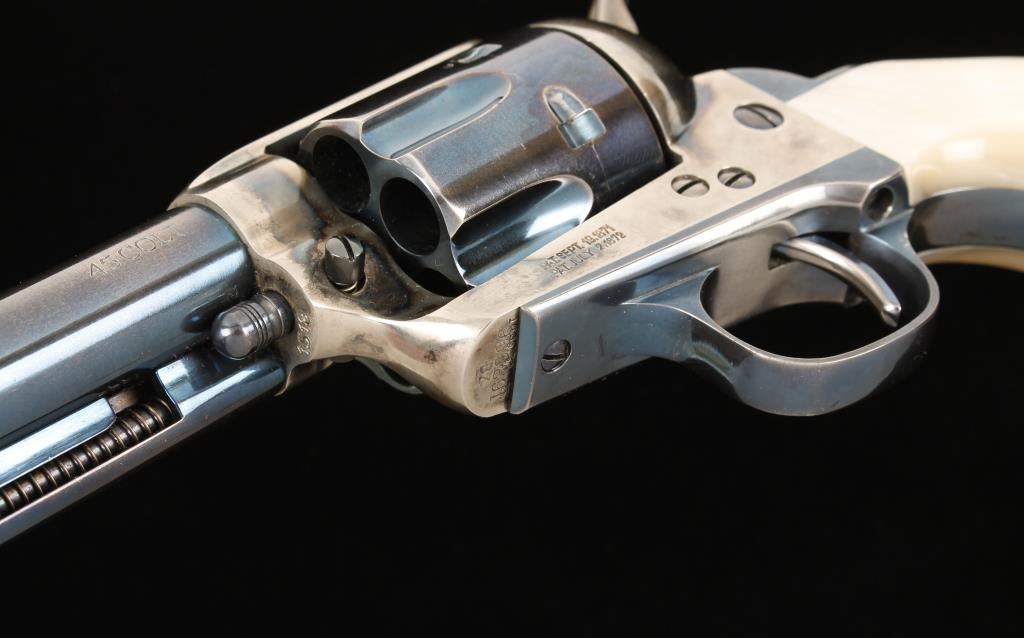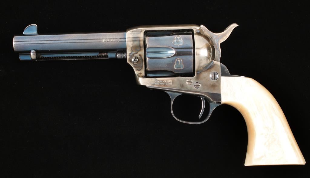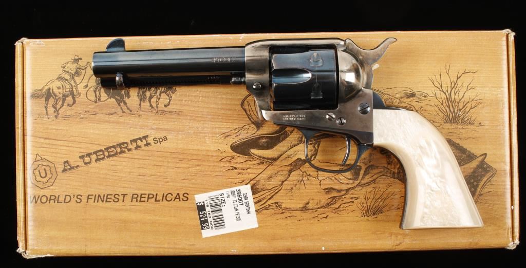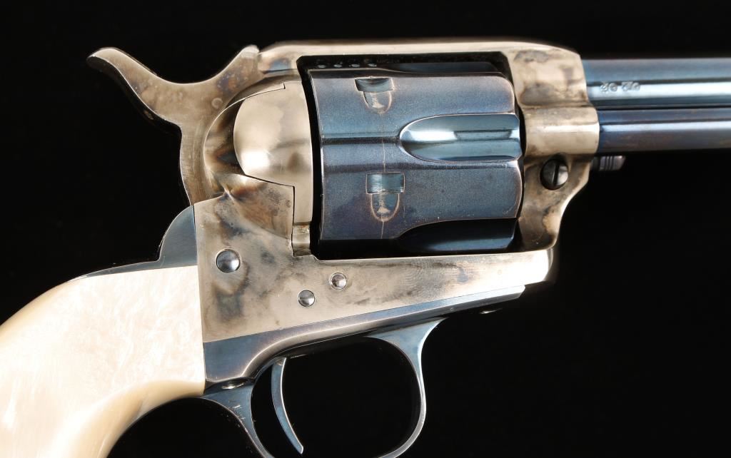 Italian made six shot revolver chambered in .45 Colt, marked Stoeger on barrel. This revolver has a custom 3 lb. action, has replaced springs and has been tuned and fitted for cowboy action shooting/re-enacting. Features a 4.75" charcoal blue finished barrel, front blade sight, case hardened frame and hammer, factory simulated mother of pear grips, charcoal blue finished cylinder, trigger, trigger guard, backstrap, cylinder pin, screws and ejector rod housing. Shows moderate wear from use and case hardened finish is turning into a bright silver in exposed areas. Condition is very good. ***Modern Firearm***