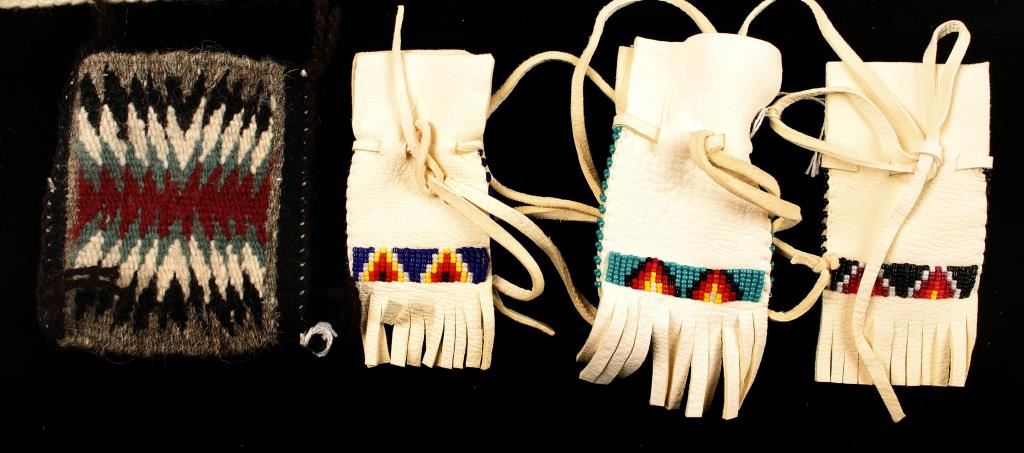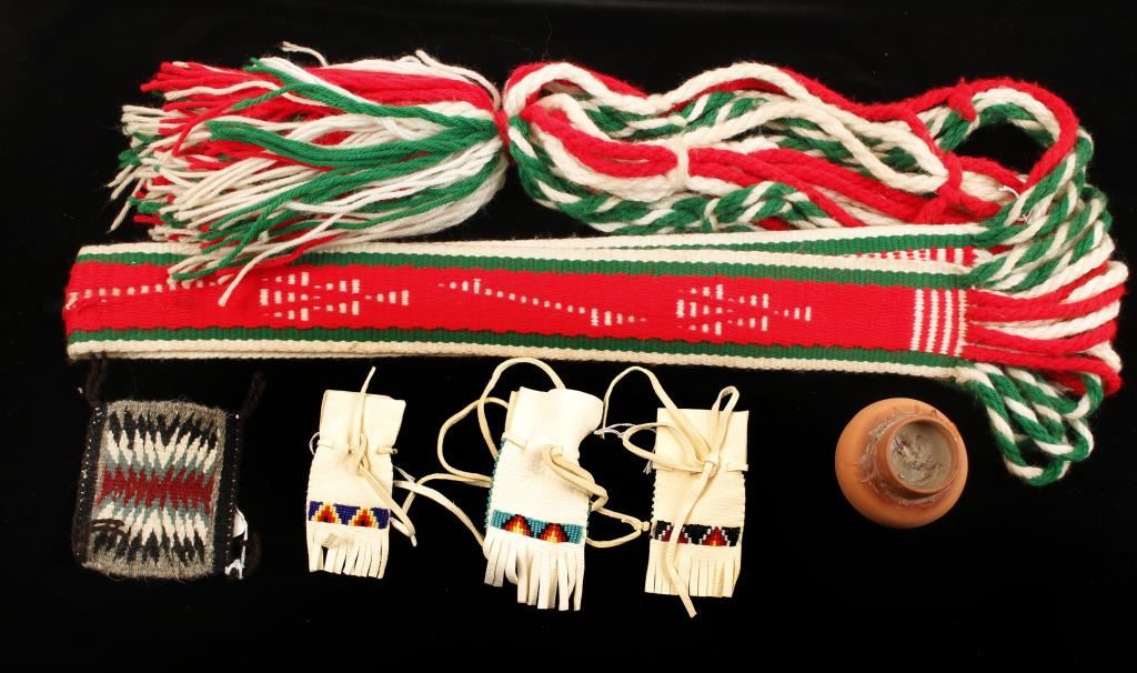 Including a white, green, and red Native American ceremonial wedding belt, a wool textile sampler, pottery tea light candle holder, and three small beaded leather pouches with fringe.
