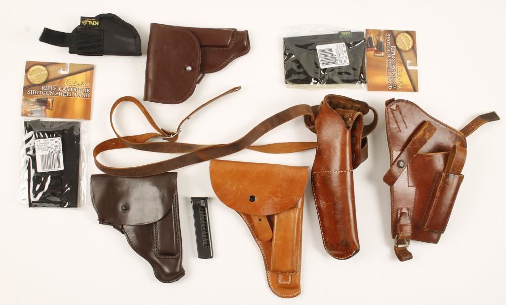3 after market leather Luger holsters, 1 Bianchi leather shoulder holster, 1 black webbing holster and 1 other leather. Also includes 2 Cabela's rifle cartridge shotgun shell bands-like new in bag.