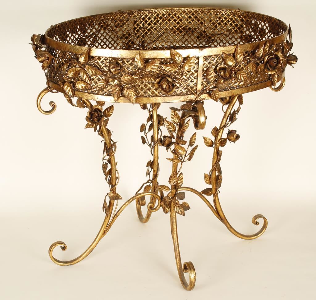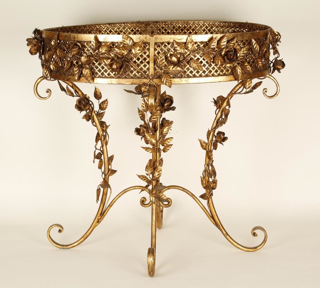 Gold tone table with curved legs that have roses and leaves intertwining around them. Oval top has lattice work around it that is also surrounded by roses. Measures 26 1/2"x29"x22".