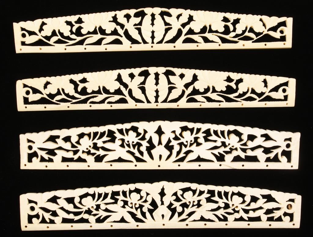 Two sets of elephant ivory plaques both with floral scroll patterns with small drilled holes that would allow them to be mounted. Measures approximately 6.75" x 1.12" In good overall condition. Not for sale outside of state of Arizona by Law & Commerce. Cannot be shipped.