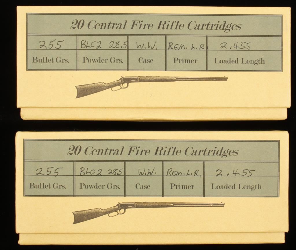 40 rounds of .38-55 ammunition with 225 grain bullets, 28.5 grains of BLC2 powder, Remington L.R. primers in Winchester Western brass shells. In vintage looking Cheyenne Cartridge Boxes.