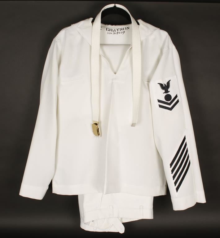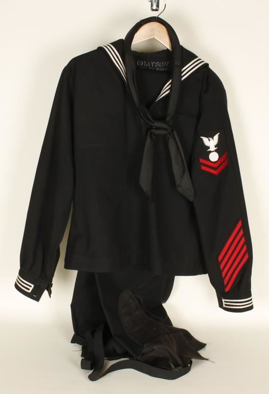 Including a navy blue wool jumper suit with neckerchief and white polyester jumper suit with belt.