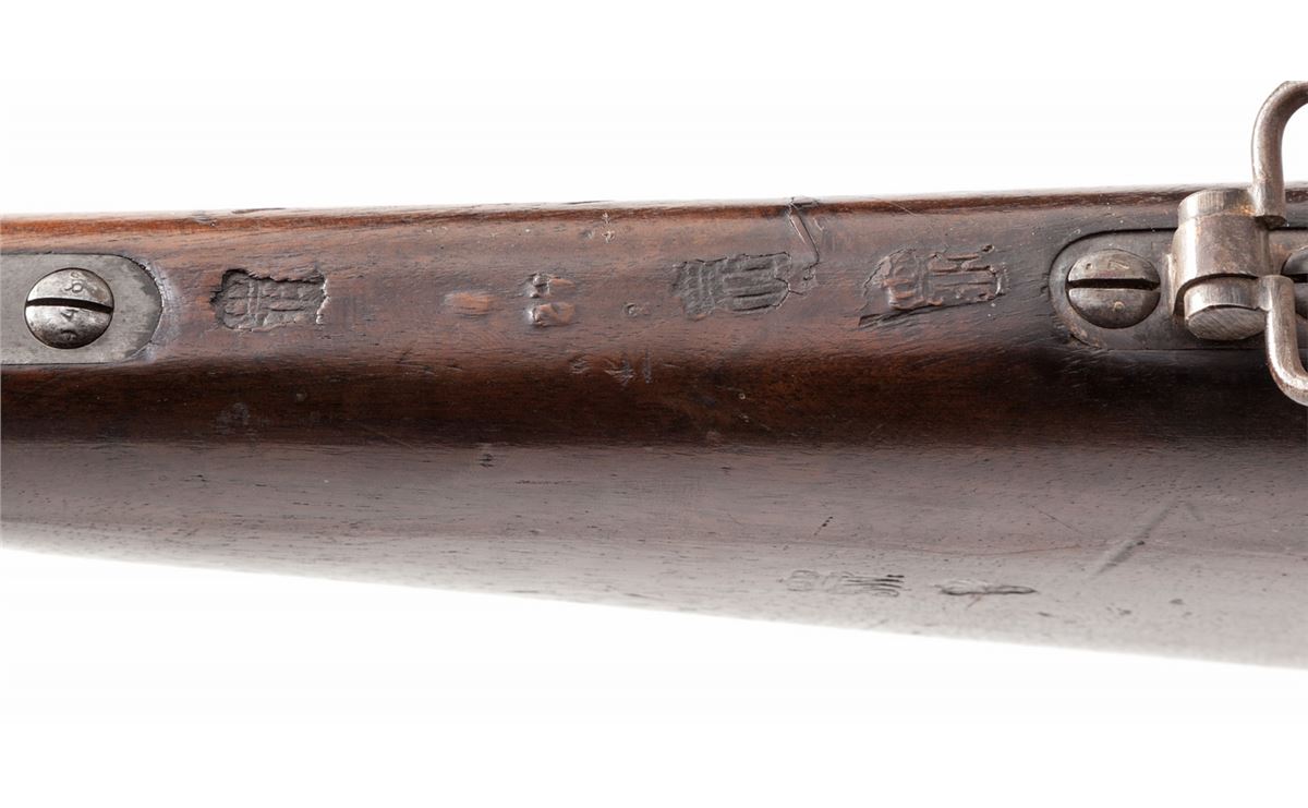 Mauser Model 1871 Bolt Action Carbine, by Oesterr, #9487D, 11mm Mauser cal., 20'' barrel, bright finish, heavily cartouched walnut stock. Mfg'd 1876. Condition is very good showing moderate to heavy carbon spotting to bright finish. Stock with scuffs, light dings and minor oil staining. Imperial cartouches are clear. All visible matching serial numbers. Regimental markings to buttplate are ''B5Ch-R/130''. Action remains crisp, bore is bright. Est.: $750-$1,000. (Antique)