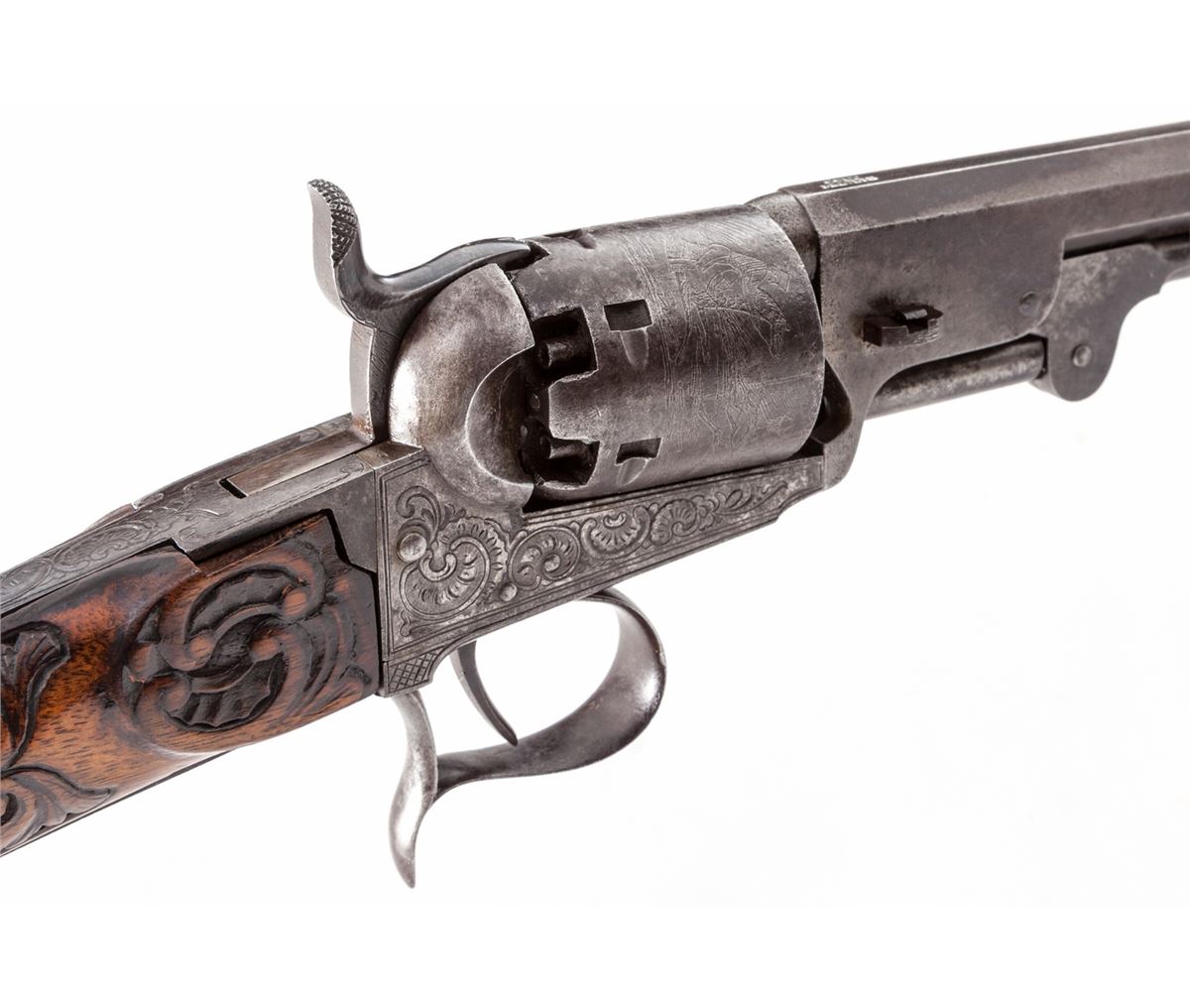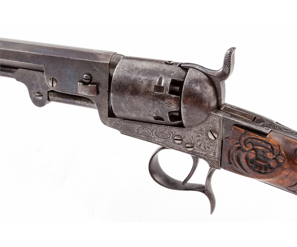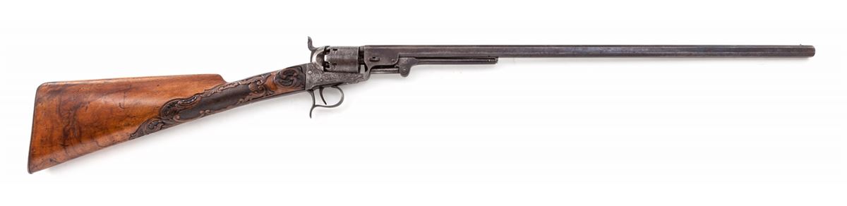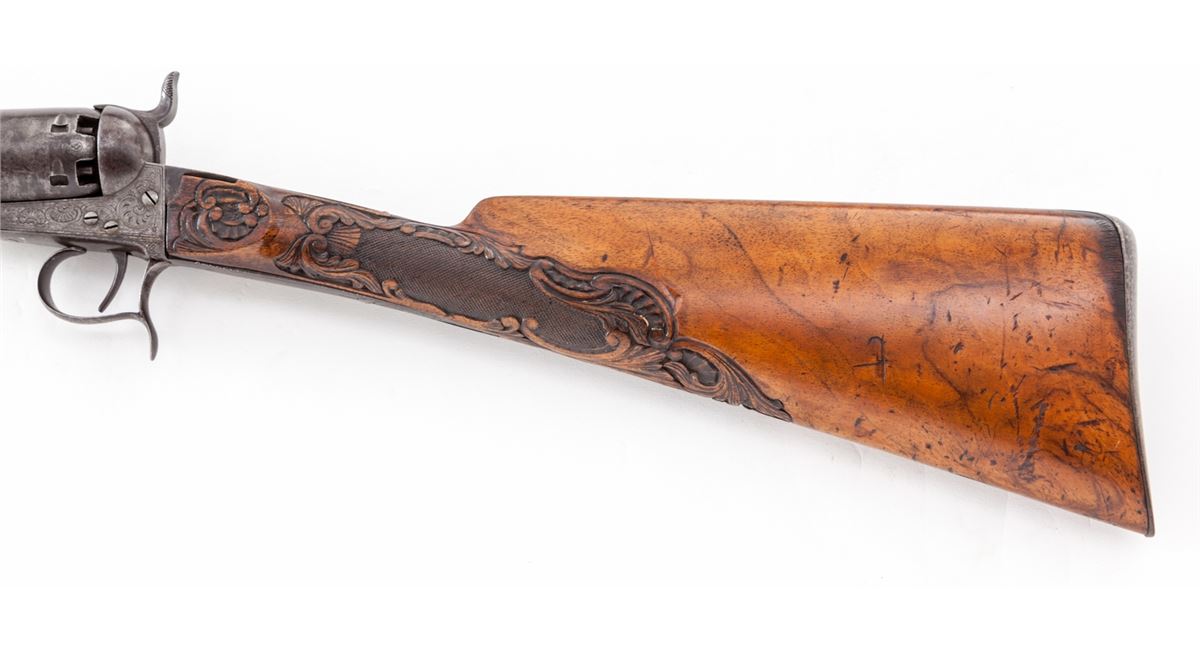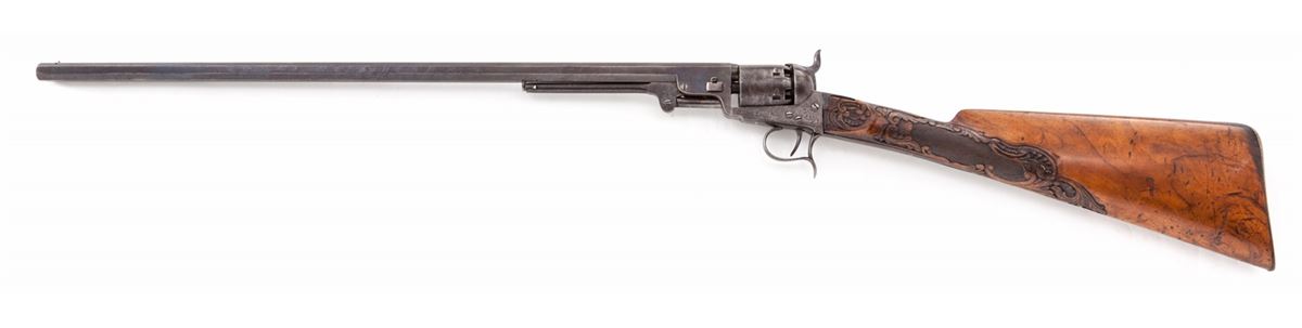 Belgian made Colt Brevete Revolving Carbine, #11283, .36 cal., 23-1/2'' barrel, engraved frame and cylinder, with semi-ornately carved European walnut buttstock. Frame with Belgian style scallop engraving. Cylinder with horse chase scene; Liege and ''(crown)/N'' proofmarks to cylinder and barrel. Condition is very good to fine retaining 60%-70% toning blue. Receiver has darkened to a medium gray. Stock with bruises and impressions and some flattening to details of carving. Action is good, bore is fine. Est.: $1,800-$2,400. (Antique)