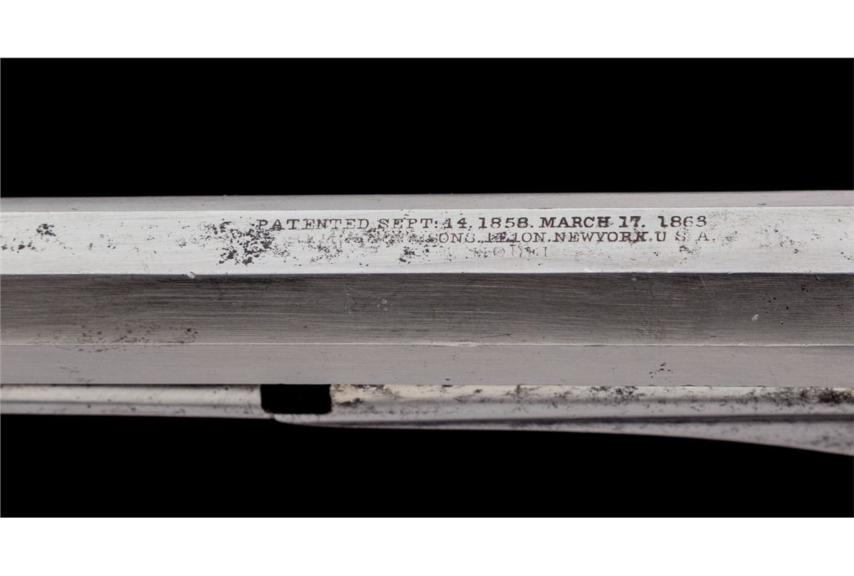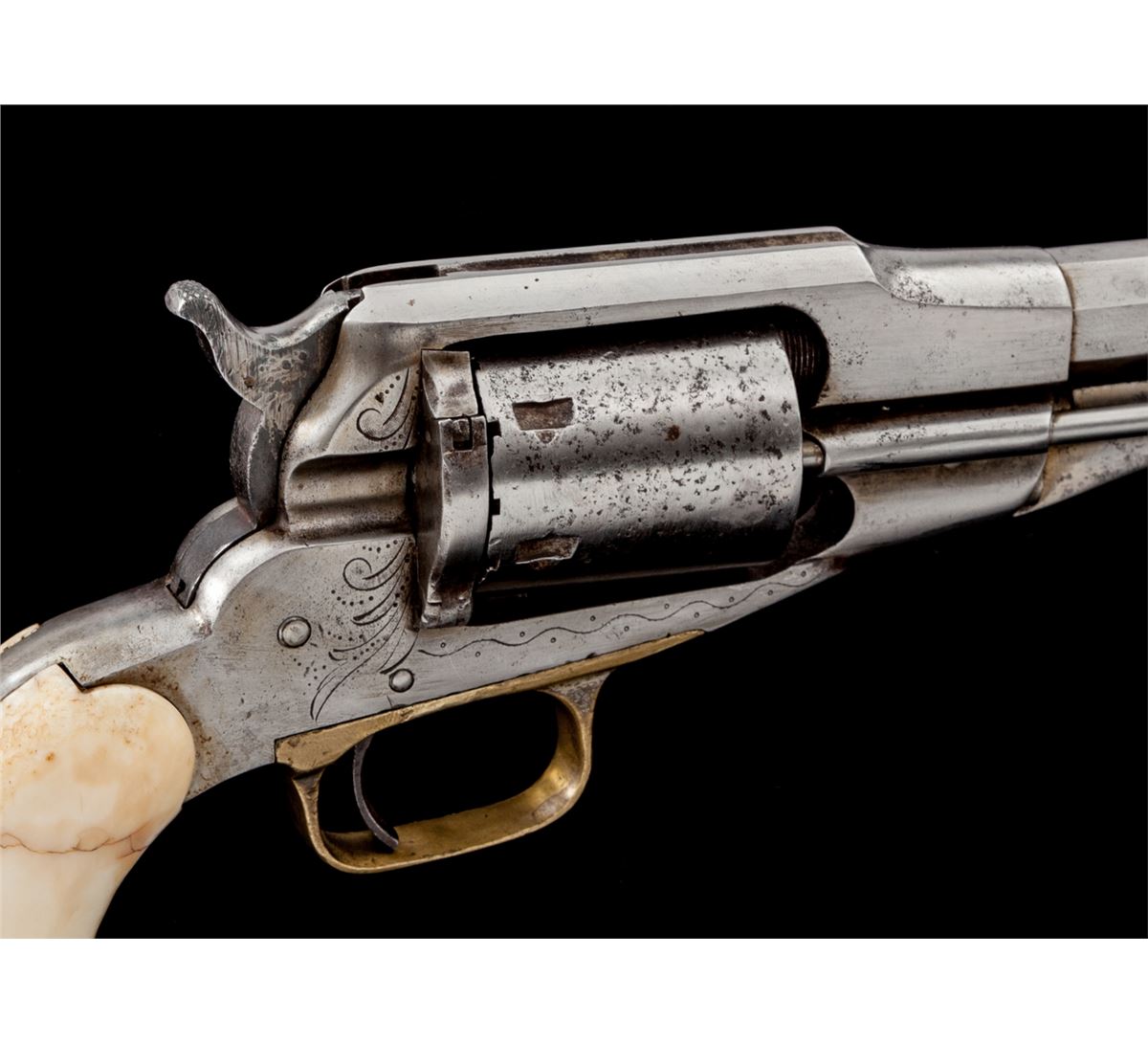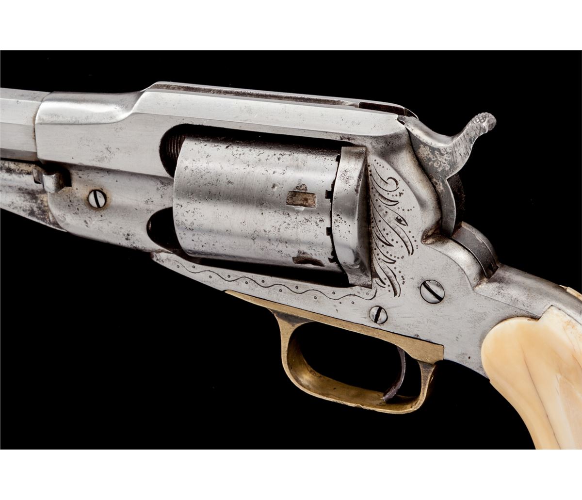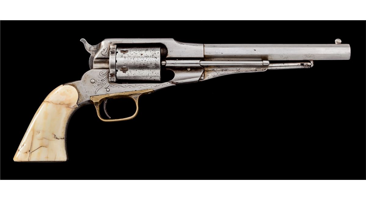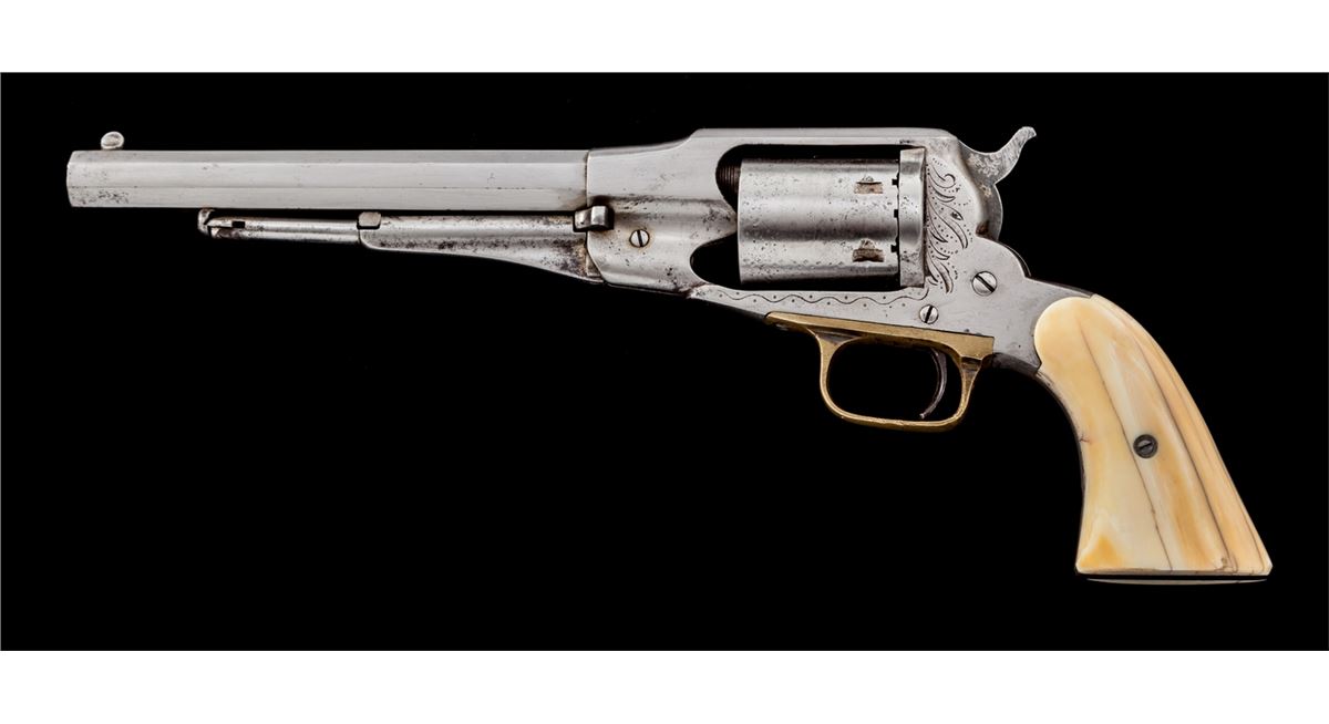 Remington New Model Navy Cartridge Conversion Revolver, #43966, .38 RF cal., 7-1/2'' barrel, originally with blue finish, mastodon grips, with light engraving to frame. Condition is mechanically fine but having been cleaned with little original finish remaining. Grips are very good with many inclusions and toning. Action is good, bore is very good to near fine. Est.: $600-$800. (Antique)