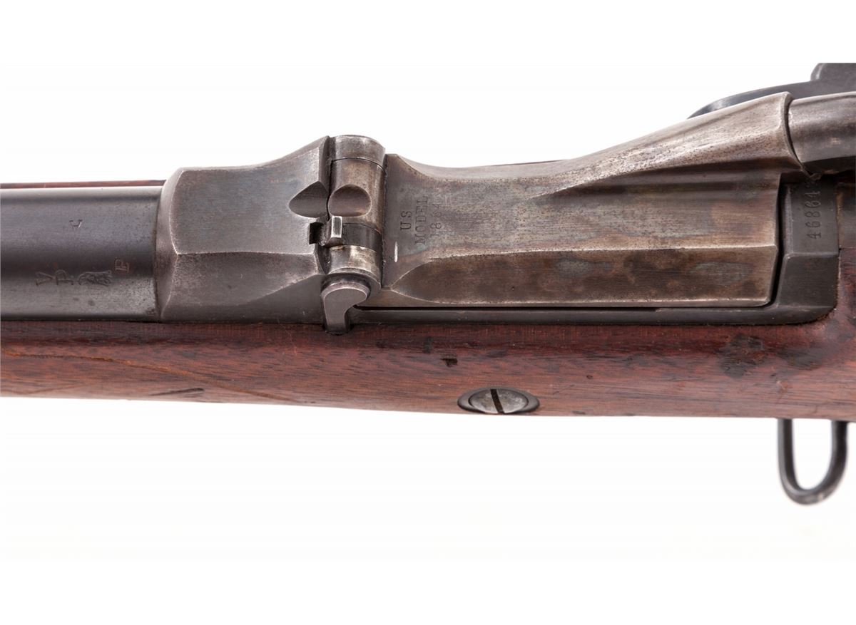 Springfield Model 1884 Trapdoor Rifle, #468642, .45-70 cal., 32'' barrel, blue finish, case hardened breechblock, 1889 cartouched walnut stock, with Buffington rear sight and ramrod. Condition is near excellent. Metal surfaces retain approx. 95% blue and case hardened finish. Stock with moderate scuffs and scratches and some oil darkening. Action is crisp, bore is bright. Est.: $1,000-$1,500. (Antique)