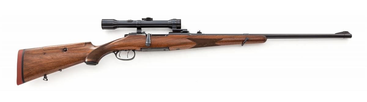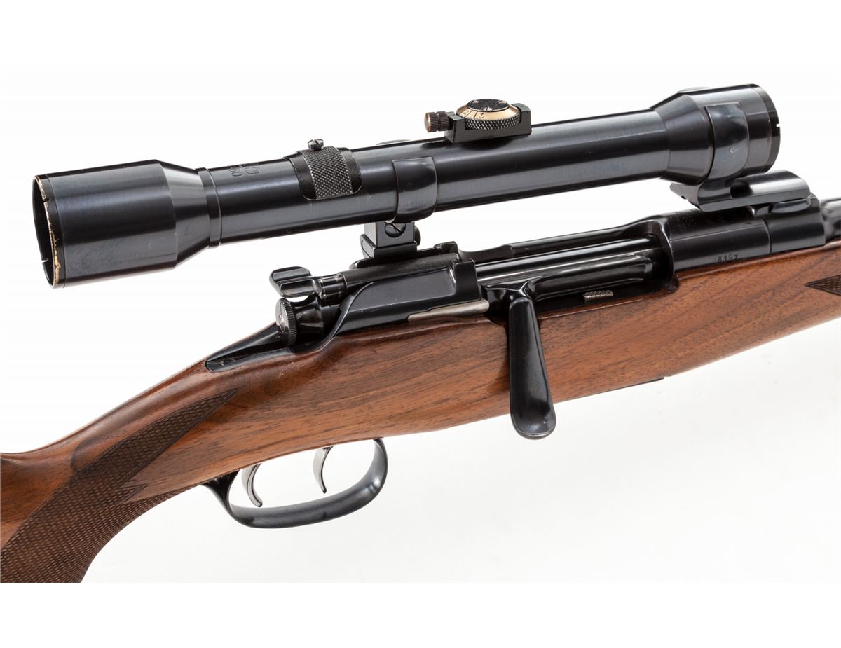Steyr Model 1950 Bolt Action Sporter, #6197, .30-06 cal., 24'' barrel, blue finish, checkered European adjustable cheekpiece walnut stock with adjustable double set triggers. Topped with a Kahles 1.25x60 scope with fine crosshair reticule and three-lug claw scope mounts. Condition is excellent retaining approx. 97% lightly thinning blue. Stock with minor scuffs and scratches and flattening to checks. Cover for small threaded piece that extends beneath the cheekpiece has gone missing. Action is good, bore is bright, scope optics are clear. Est.: $800-$1,200. (C&R)
