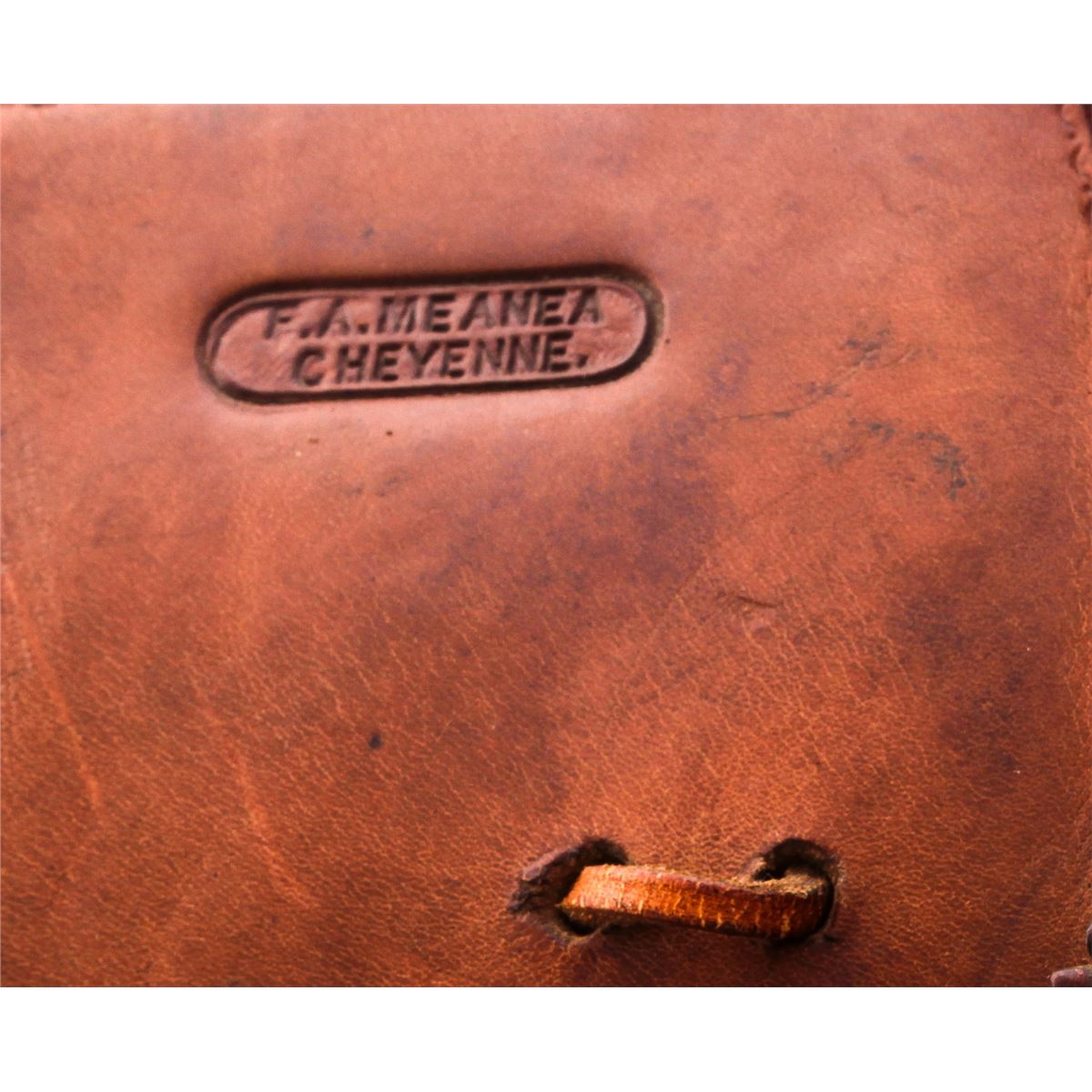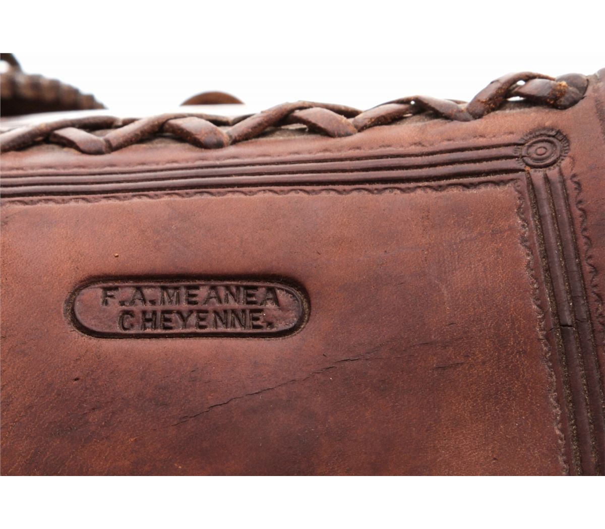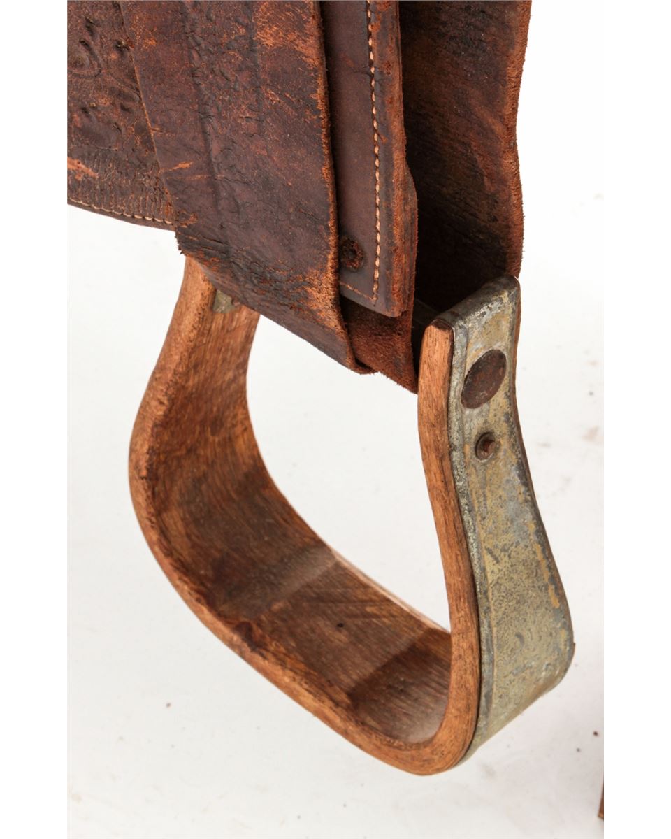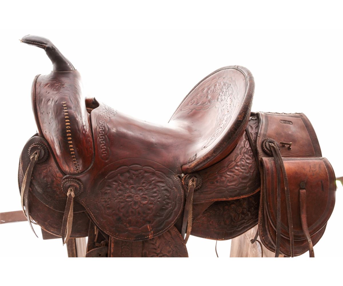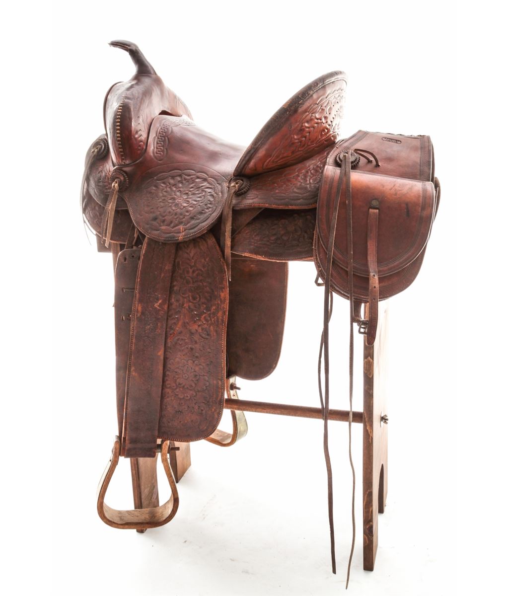 Early 20th Century Tooled Leather Saddle, by F.M. Stern, San Jose, CA, with high-back Calif. cantle, tooled leather seat, fenders and skirt, and leather covered horn. Nicely accomplished by California's oldest saddlemaker (F.M. Stern), who opened shop in San Jose in 1852. Condition is very good with metal covered wood stirrups. Shows even overall wear. Saddle additionally features a nice pair of small saddlebags marked ''F.A. Meanea/Cheyenne''. Est.: $500-$750. (Stand not included.)