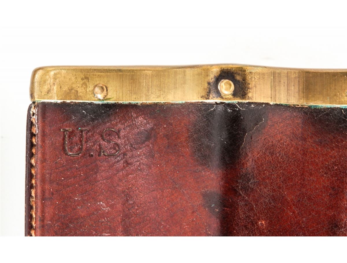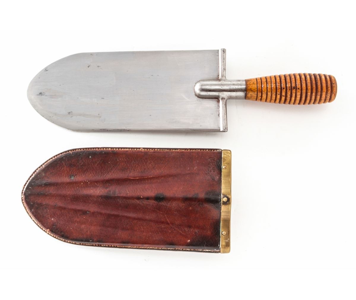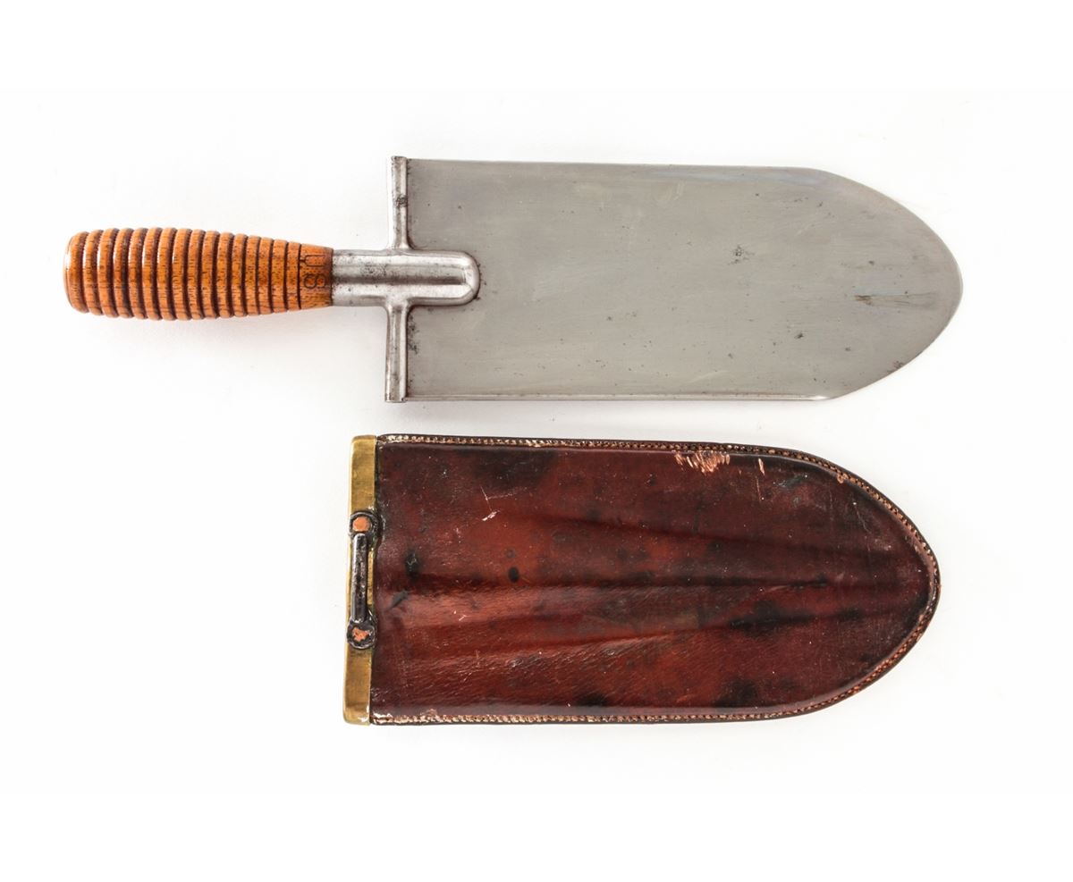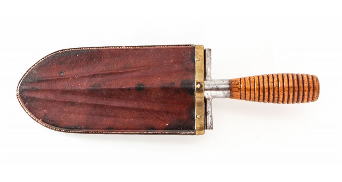 U.S. Model 1880 Entrenching Tool, blade length is 8-1/4'', blade width is 3-1/2'', overall length of the tool is 12-3/4'', with ribbed wood handle marked ''US'', and rounded guard. Included is the leather covered sheath, also stamped ''U.S.'', with brass throat and steel belt hanger. Condition is fine overall. Metal surfaces with light scattered carbon spotting. Leather sheath with light to moderate scattered darkening and impression;, stitching and seams remain tight. Est.: $300-$500.
