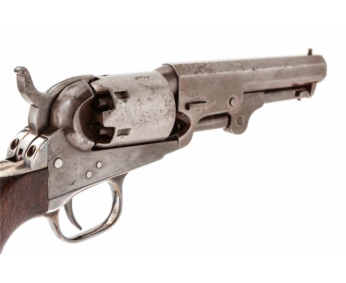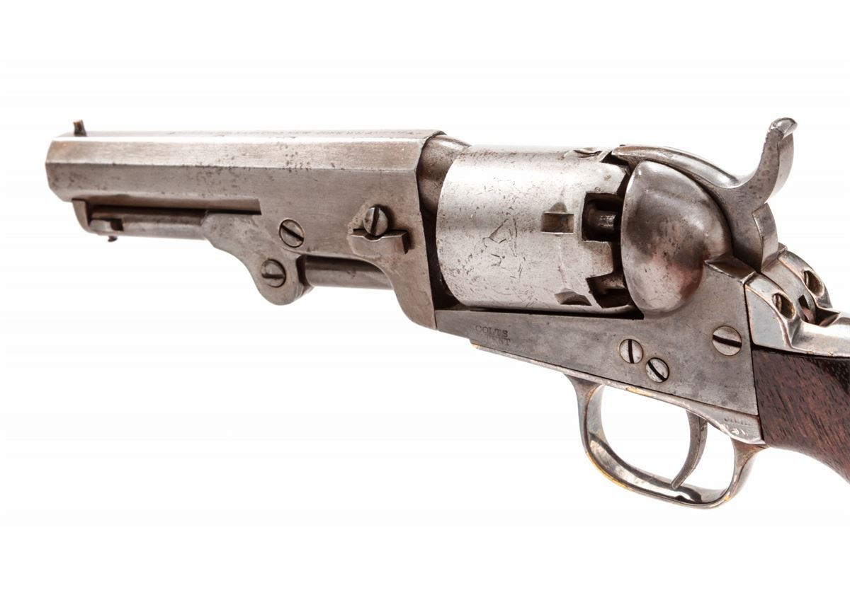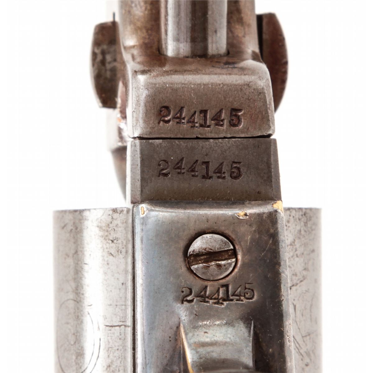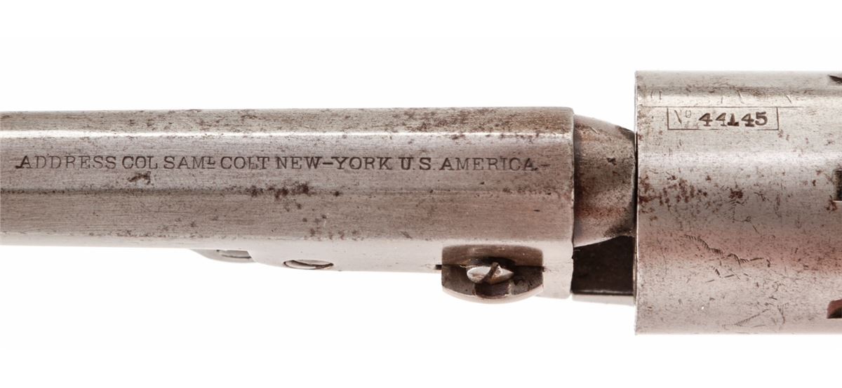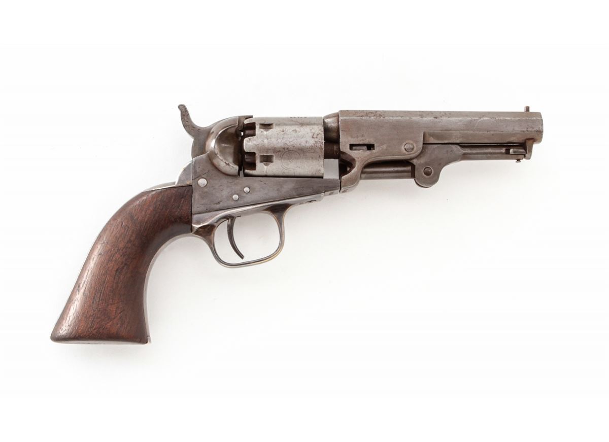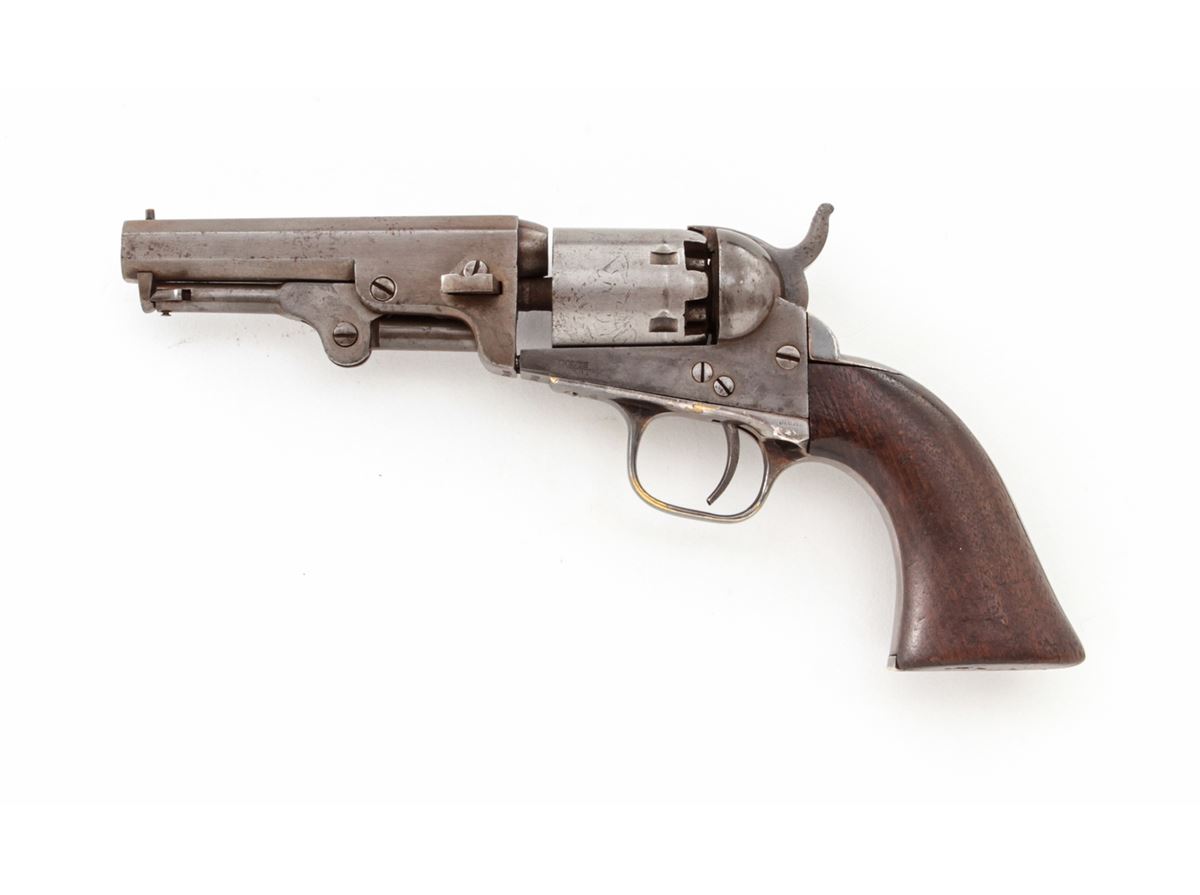 Colt 1849 Pocket Model Revolver, #244145, .31 cal., 4'' barrel, blue and case hardened finish, silver backstrap and triggerguard, with original one-piece walnut grips. Mfg'd 1863. Condition is good to very good as cleaned and partially refinished. Grips with very light scuffs and scratches. Good functioning action, dark bore. Est.: $500-$750. (Antique)